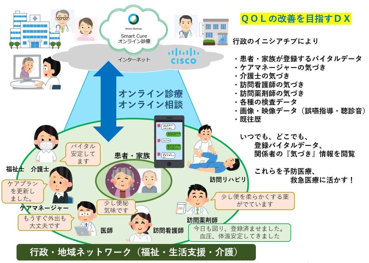 - 見守り機能から、多職種連携を経由、早期のオンライン診療へつなげる仕組みを提供する。