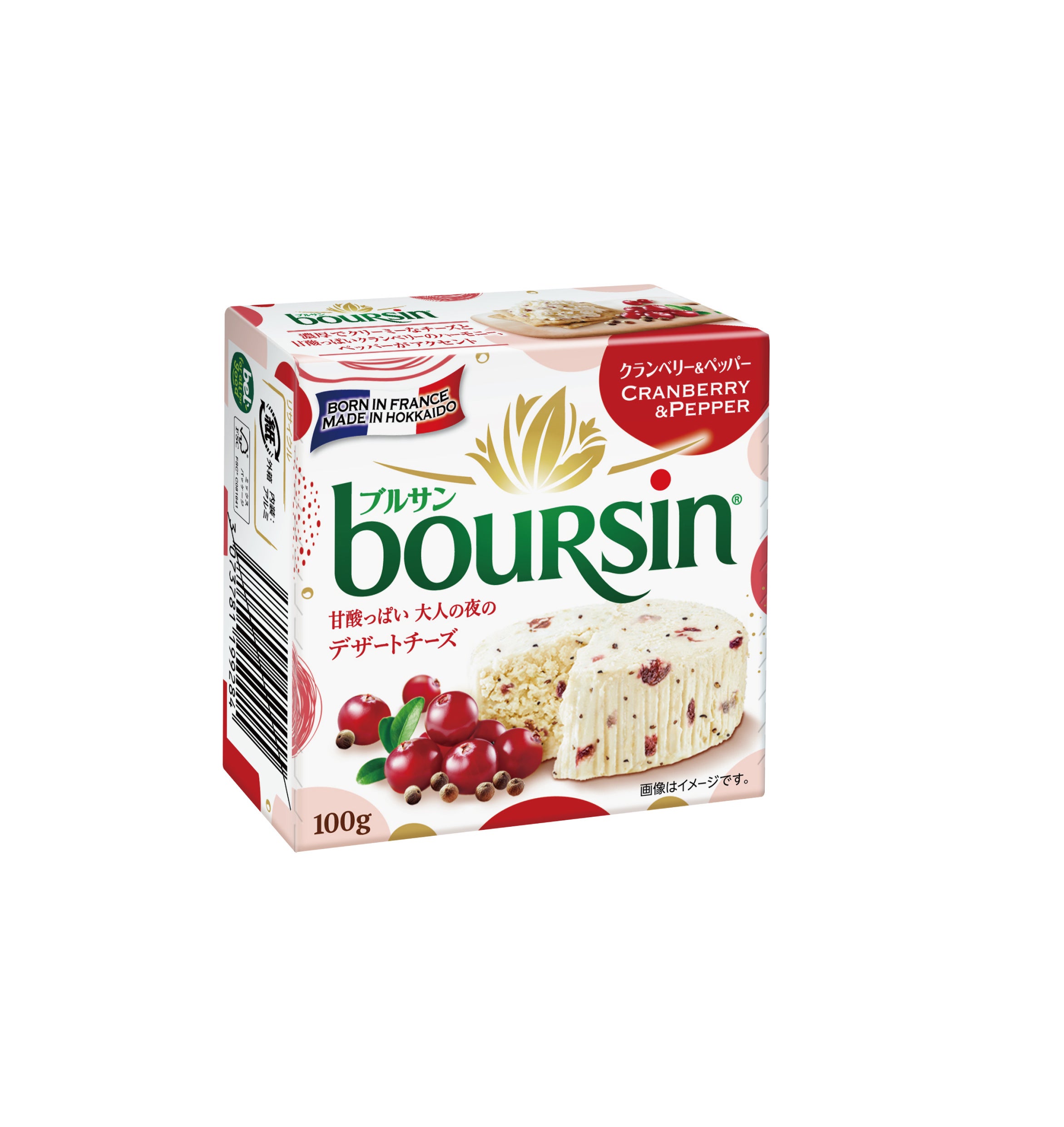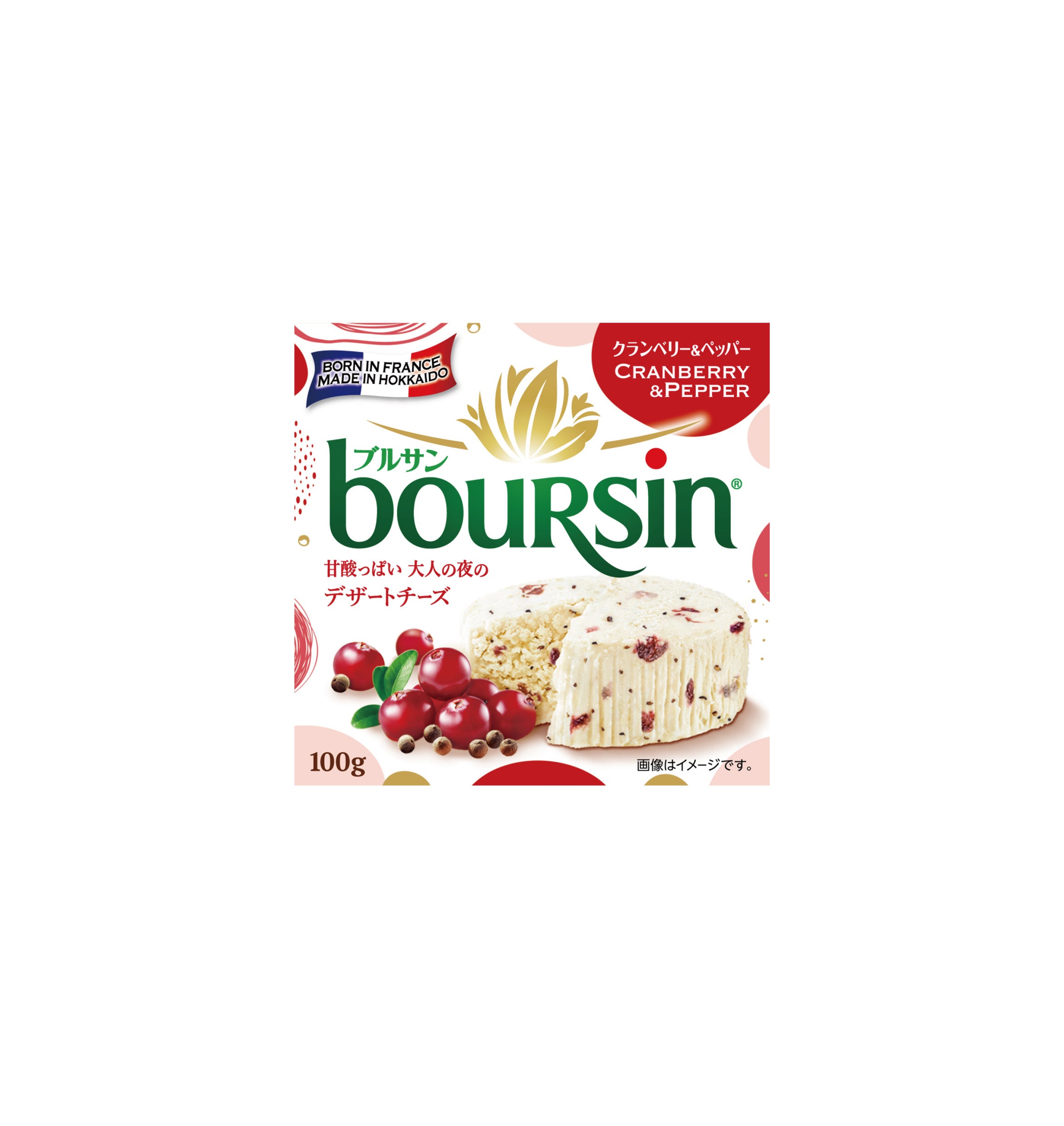 「ブルサン」は、フレッシュチーズならではのミルク感あふれる濃厚なチーズの味わいと、厳選されたハーブや香辛料などの豊かな香り、なめらかな口どけ、そしてほろほろとした独特の食感が特長。フランスでは、「ブルサンを知らないフランス人はいない」と言われるほど、家庭の食卓に定着しているチーズです。そんなブルサンから約5年ぶりとなる新フレーバー「クランベリー&ペッパー」が新登場。2017年まで販売をしていた「クランベリー」から、本製品はクランベリーを約19%増量*し、ブルサンチーズの濃厚さはそのままに、甘酸っぱいクランベリーの味わいと、ピリッとするペッパーがアクセントになる“甘酸っぱい大人の夜のご褒美デザートチーズ”です。