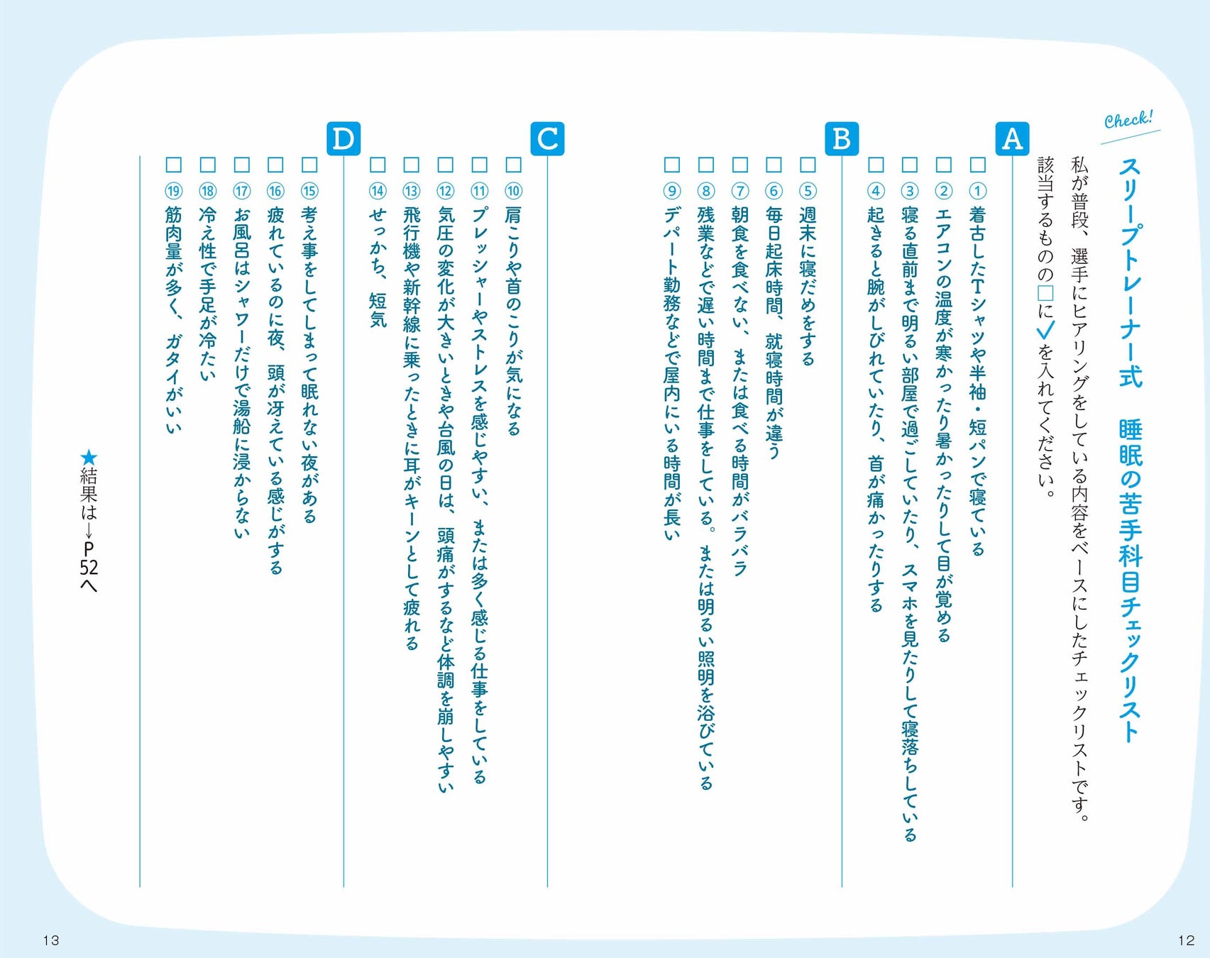 本書では、著書が普段アスリートにヒアリングしている内容をベースにした「スリープトレーナー式 睡眠の苦手科目チェックリスト」で、自分が眠れない原因を把握し、その対策となるスリトレ(スリープトレーニング)ができます。