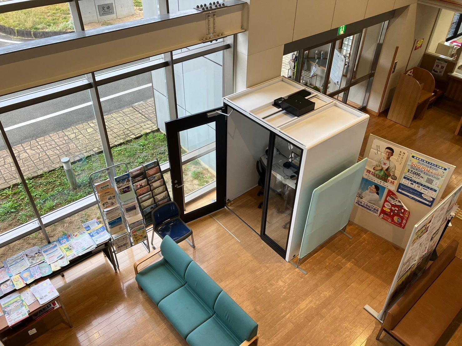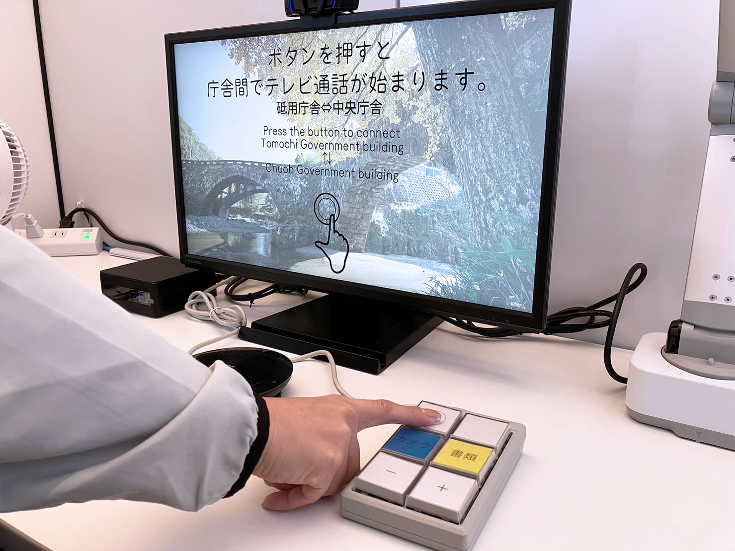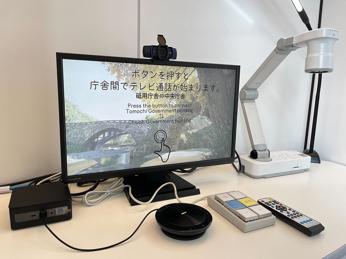 庁舎ロビーに専用の相談ブースを新設。カメラとスピーカが設置されており、テレビ電話による遠隔相談が可能です。手元の書画カメラに切り替えることもできるため持ち込みの書類や細かな資料を見ながら話すこともできます。