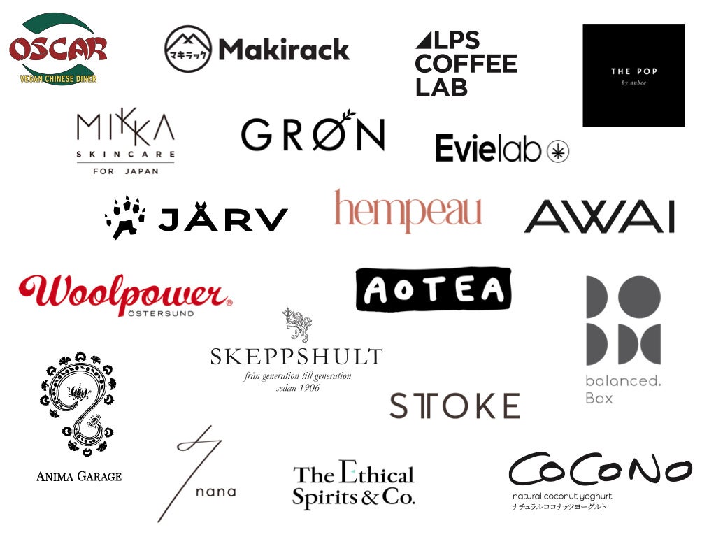GRØN:植物性スープ・プロテイン/Nubee:ヴィーガンチョコレート/Cocono:ココナッツヨーグルト/STTOKE:リサイクルカップ/Ethical Spirits:クラフトジン/Whole Sum Japan:マヌカハニーコスメ/Balanced Box:サブスク型セルフケアアイテム/UPI:アウトドア用品/Mikka:CBDスキンケア用品/Alps Coffee Lab:インスタントコーヒー/Hempeau:CBDフェイスマスク、 ビキニマスク/AWAI:グリーンスムージーパウダー・CBD/ANIMA GARAGE:フラワーショップ / Oscar Chinese Restaurant: アメリカンスタイルビーガンチャイニーズフード / UPPER HOUSE: ライフスタイルプロダクト全般 / エアビル不動産: 不動産コンシェルジェ / 7na: ジェルネイルシール