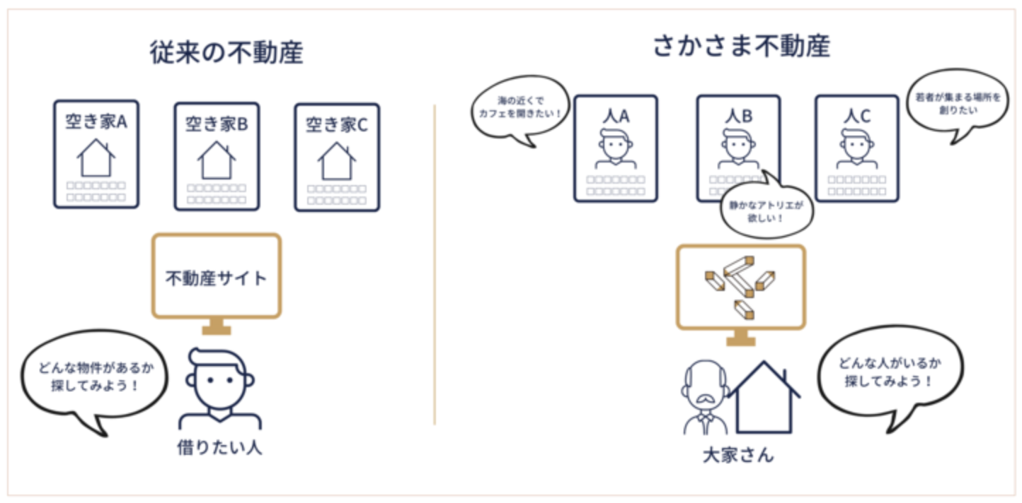 さかさま不動産は、空き家の情報ではなく「借りたい人」の情報を開示してマッチングをするサイトです。従来の不動産流通の仕組みを逆にすることで、「借り手を選びたい」「家情報を公開せず借り手を探したい」と考える大家や、地域との相性を踏まえた移住者誘致に繋げたい人などに有効となります。
