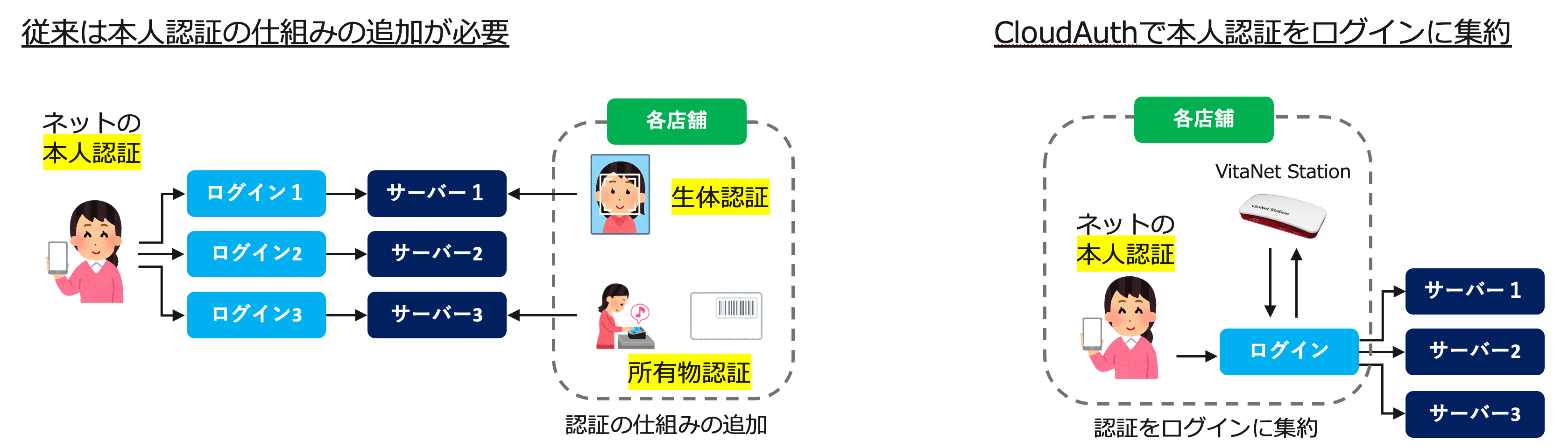 VitaNet CloudAuth(ヴィタネット・クラウド・オース)は、各社の公式アプリが誰が来店したかを自動認証して手ぶらでお店にチェックインできるようにします。従来は困難だった店舗とアプリの買い物体験の共通化により、公式アプリが集客やリピートの向上、売り上げ拡大に貢献します。