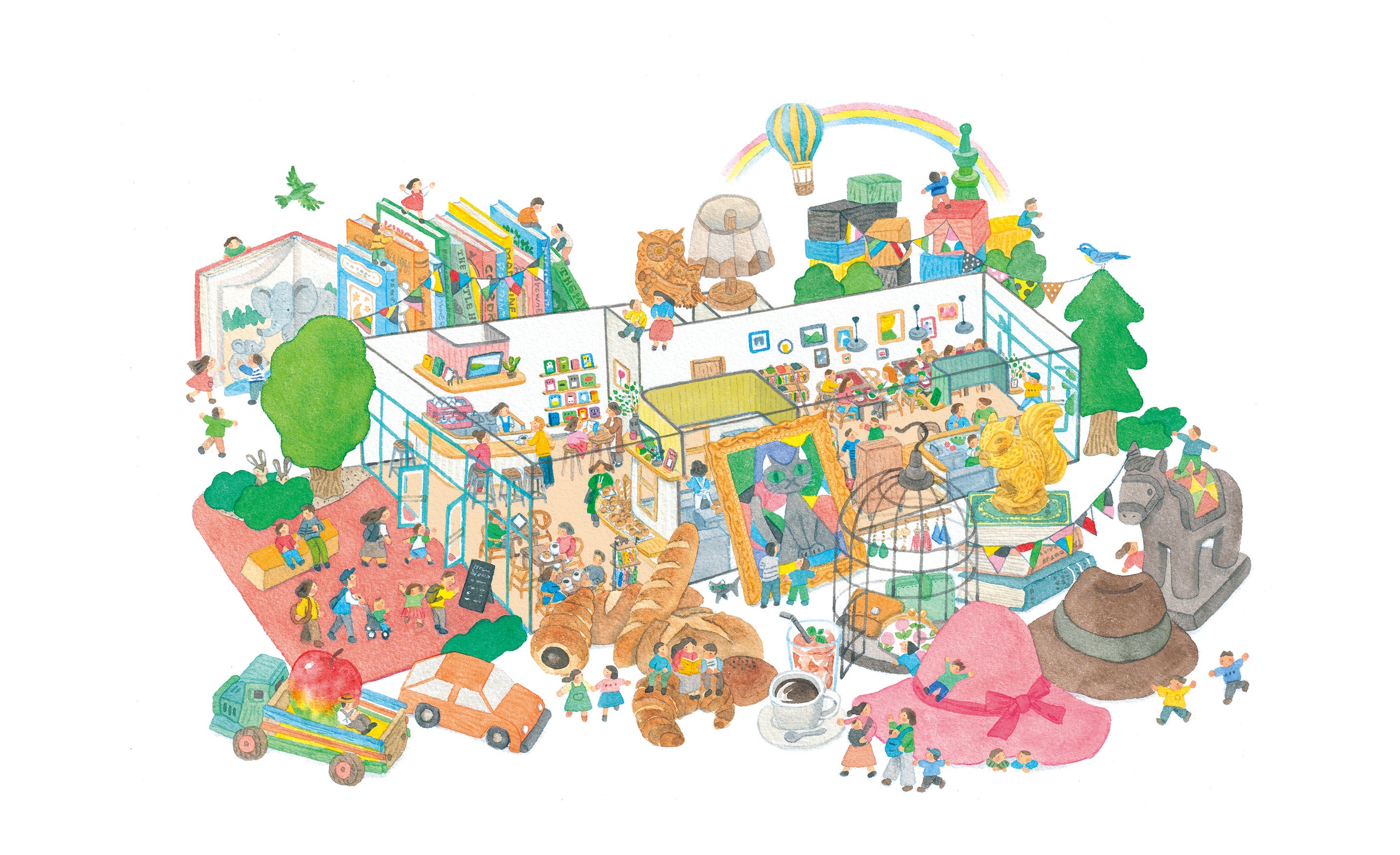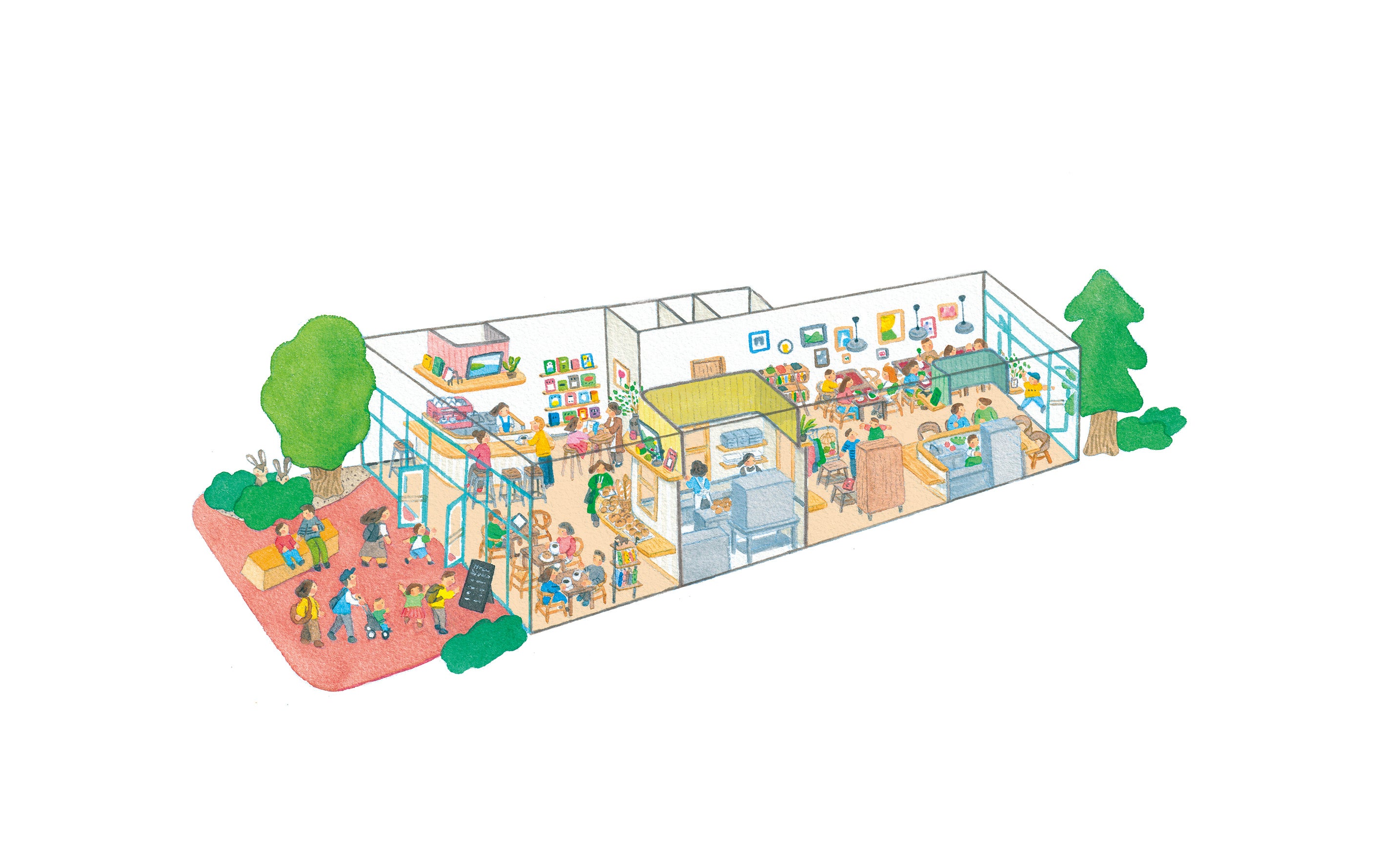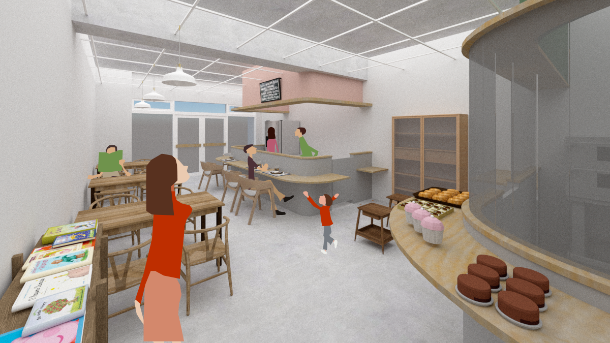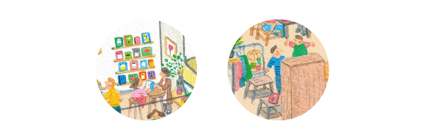 3つのシェア型カフェの合間には、ショップスペースとして、シェア型シェルフを設置します。棚貸し本屋さんのようなものですが、ここには本棚だけではなく、さまざまな什器をたくさん設置。それぞれを個人が毎月定額でレンタルして、本や服、レコードなどを持ち込んで、手作りしたもの、おうちにある大切なもの、ここで展示、販売ができます。(※料金(予定):2,000 - 4,000円/月)
