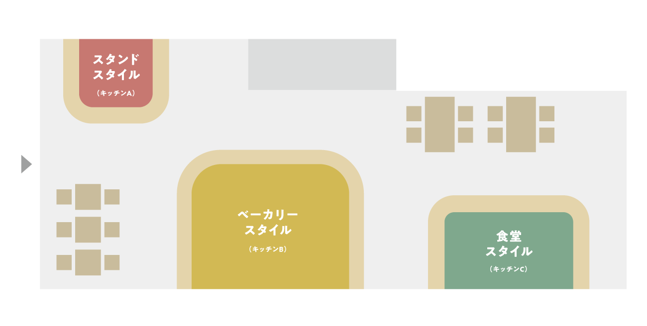 お店に入ると、小・大・中と3つのシェアキッチンが配置されています。それぞれ特徴ある3つのスタイルのキッチン。曜日ごとにデイタイムとナイトタイムの時間枠があるので、自由にレンタルしていただくことが可能です。たとえば、こんな使い方はどうでしょう