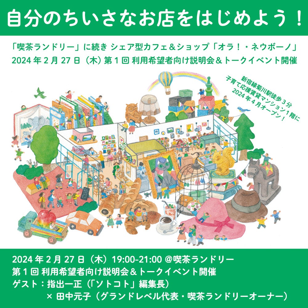 自分のちいさなお店をはじめよう!シェア型カフェ&ショップ「オラ!・ネウボーノ」菊川駅近く 子育て応援賃貸マンション1階に2024年春オープン!2024年2月27日 第1回 利用者向け説明会 開催!