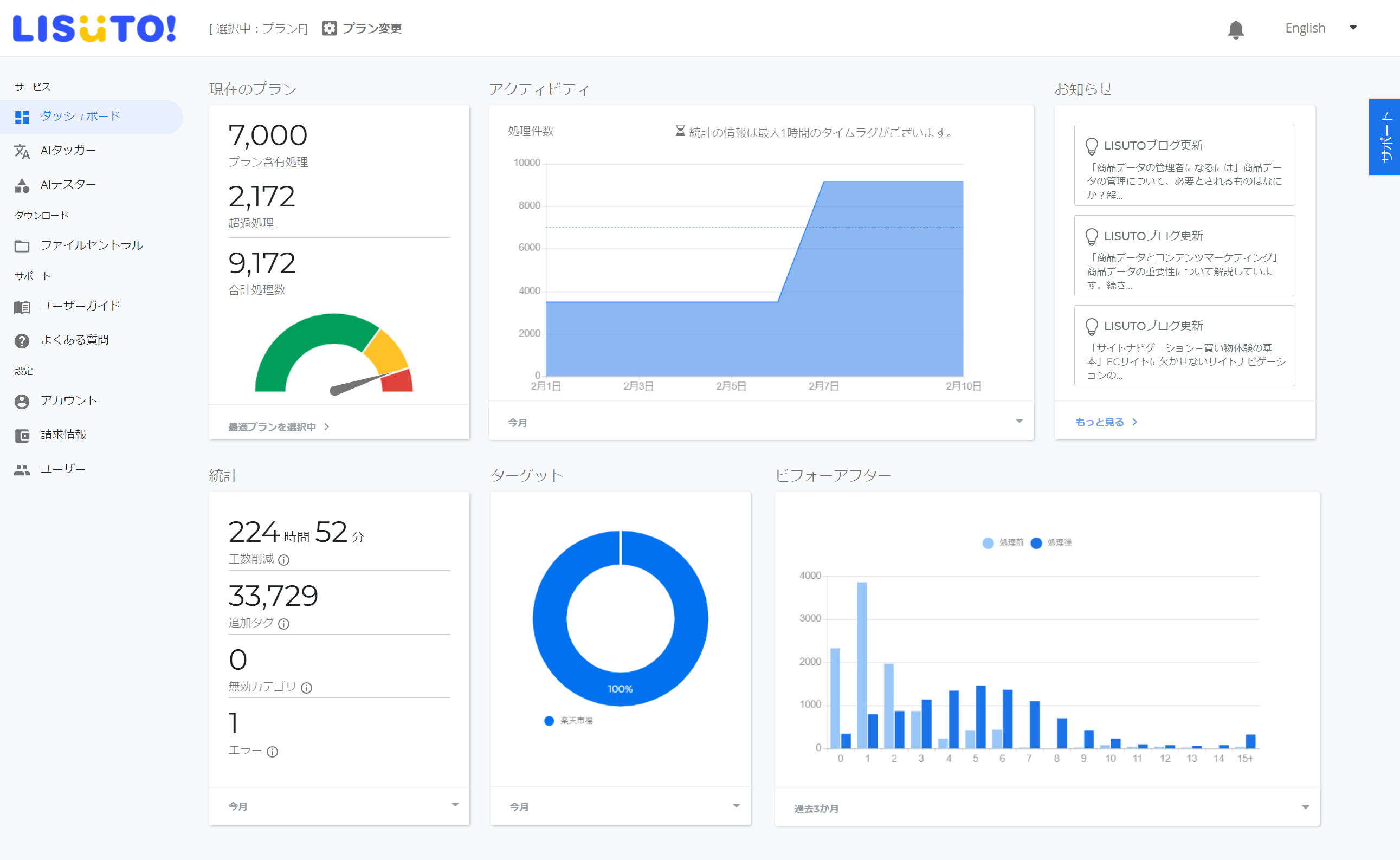 「AIタッガーⓇ」は、楽天市場やYahoo!ショッピング等のECモールで商品を出品する際に行う商品のタグ付けを自動化するツールです。商品CSVファイルを入力すると、ファイルに含まれるテキスト情報からAIが商品の特徴を判別し、適切なタグを最大限出力することが可能です。