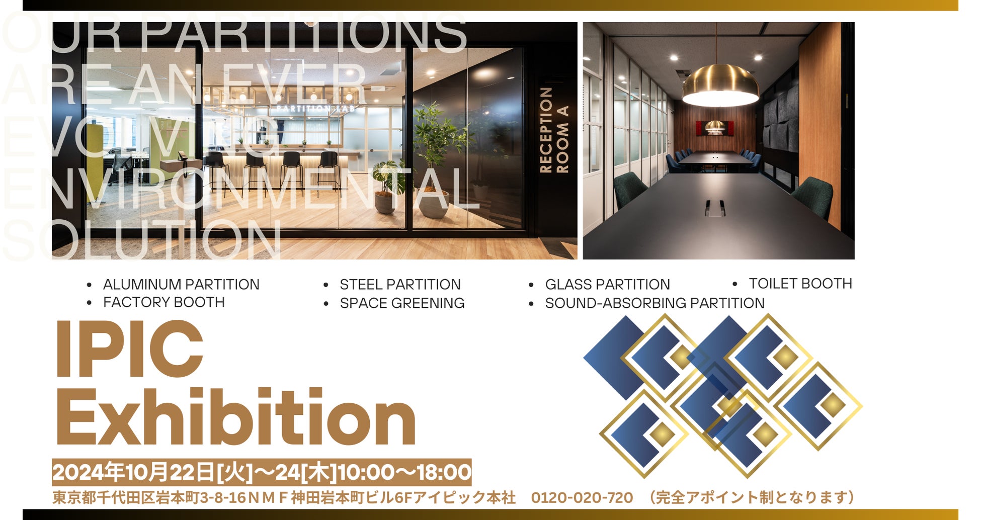 「アイピック株式会社は創業40周年の節目迎えました。パーティション専門メーカーとして、、より多くのお客様に向けて最新のサービスを提供していくことを目指し、新たなビジネスチャンスを切り拓いていくことを約束します。ぜひご来場ください。」