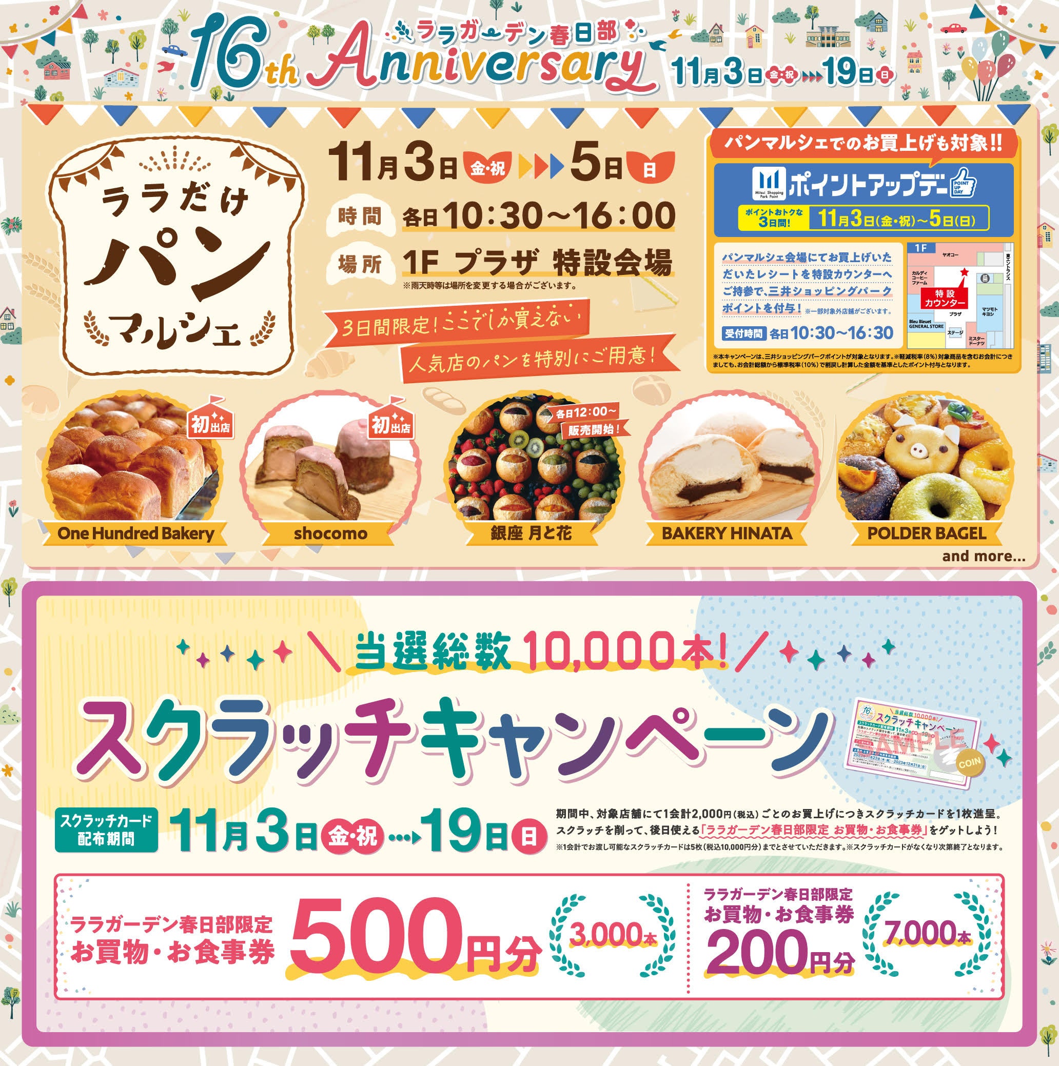 期間中は、今だけの参加店舗のおトクなセールや各種特典と共に、ララガーデン春日部でしか買えない人気店のパンをご用意した「ララだけパンマルシェ」や、当選10,000本の「スクラッチキャンペーン」を開催し“感謝のキモチ”をお届けします。