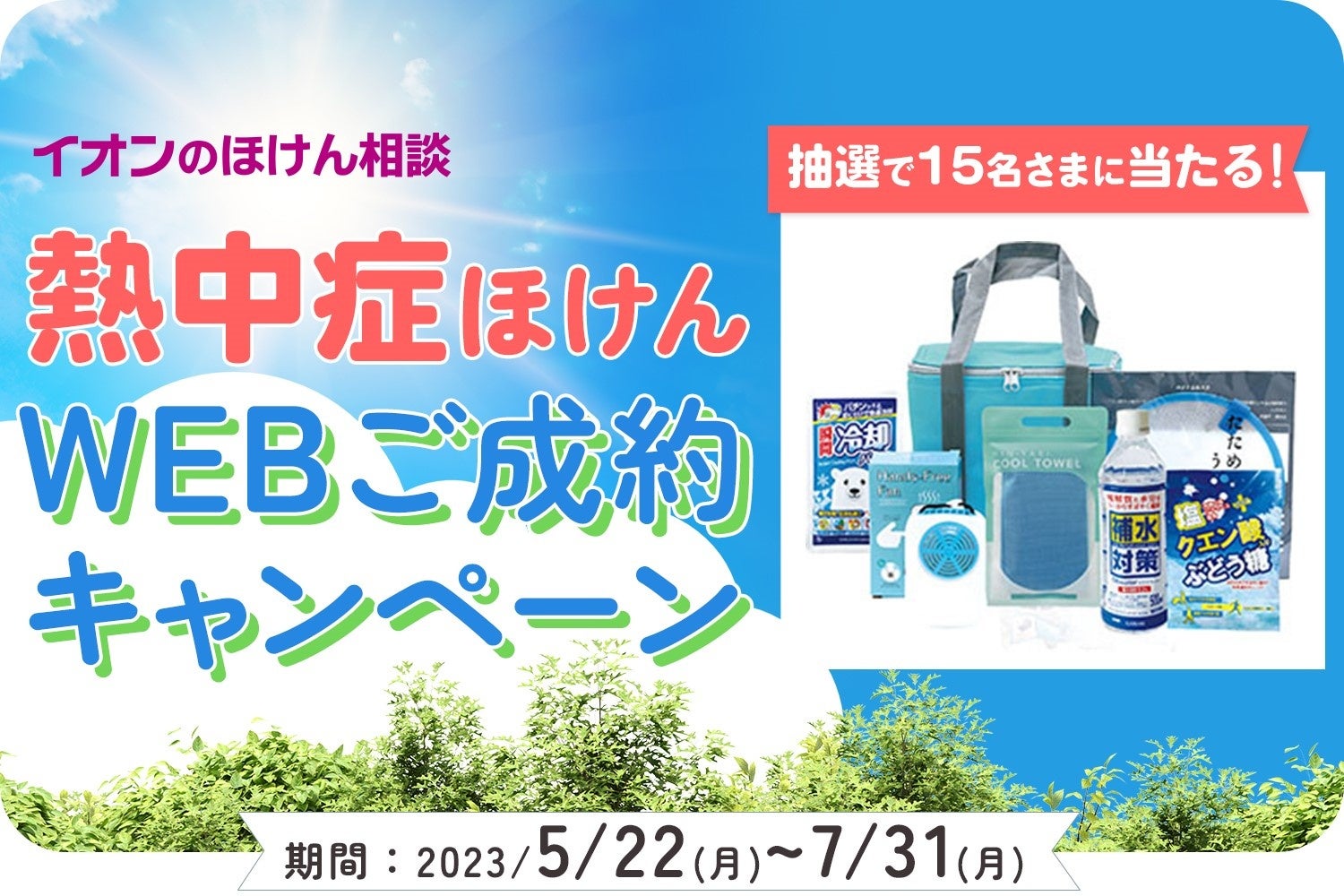 期間中に当社ホームページのイオン保険マーケット(https://www.hokenmarket.net/)経由で「ネットでかんたん保険 熱中症プラン(熱中症危険補償特約セット傷害総合保険)」にお申込みいただき、ご成約いただいた方の中から抽選で15名さまに「暑さ対策7点セット」をプレゼントいたします。