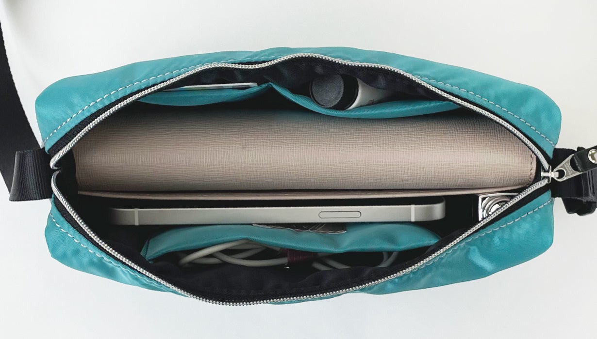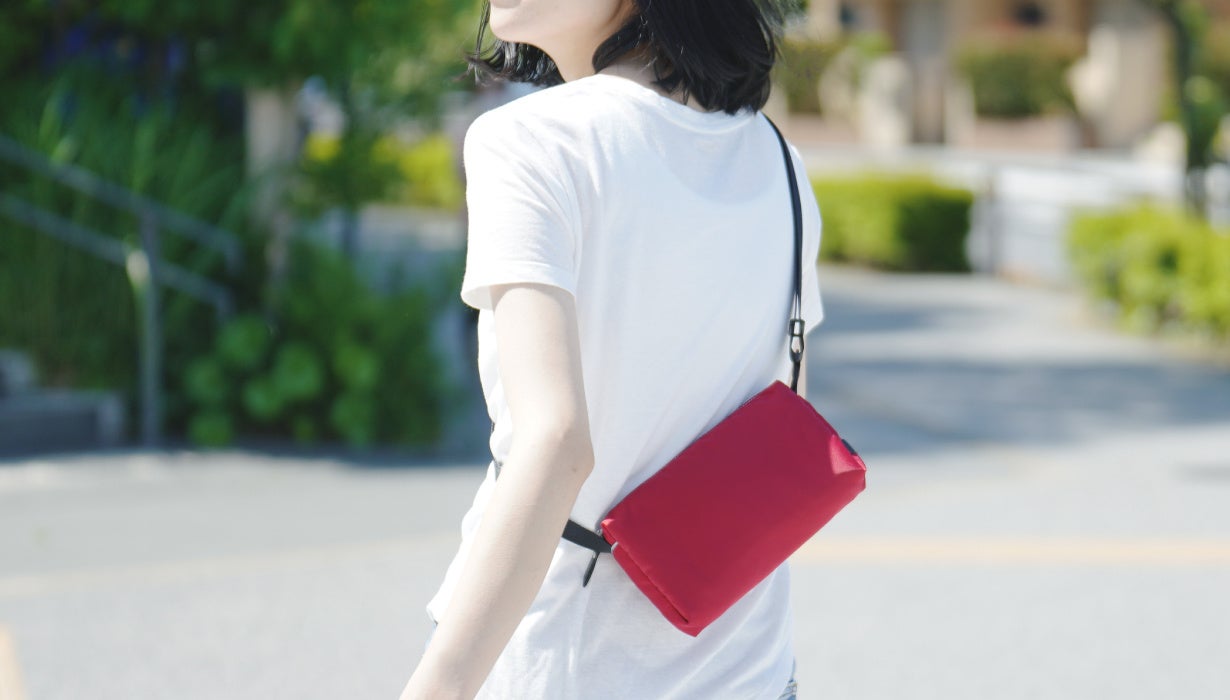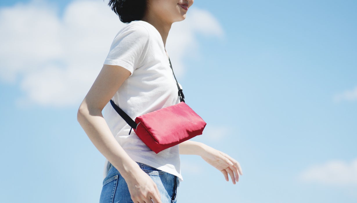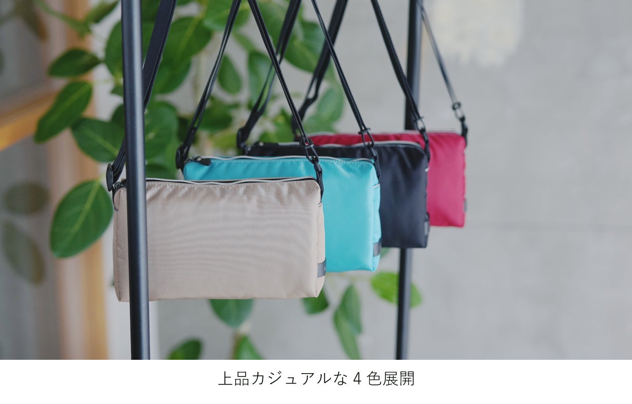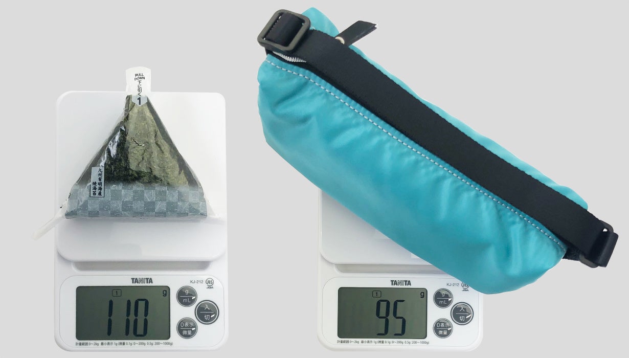 ショルダーストラップを含めて、総重量95g!コンビニおにぎりが110gくらいありますのでそれよりも軽く、バッグの存在を忘れてしまうほどの軽さです。 ポケット感覚でスマホや貴重品を入れて軽やかに動き回りたい人に使ってほしいバッグです。