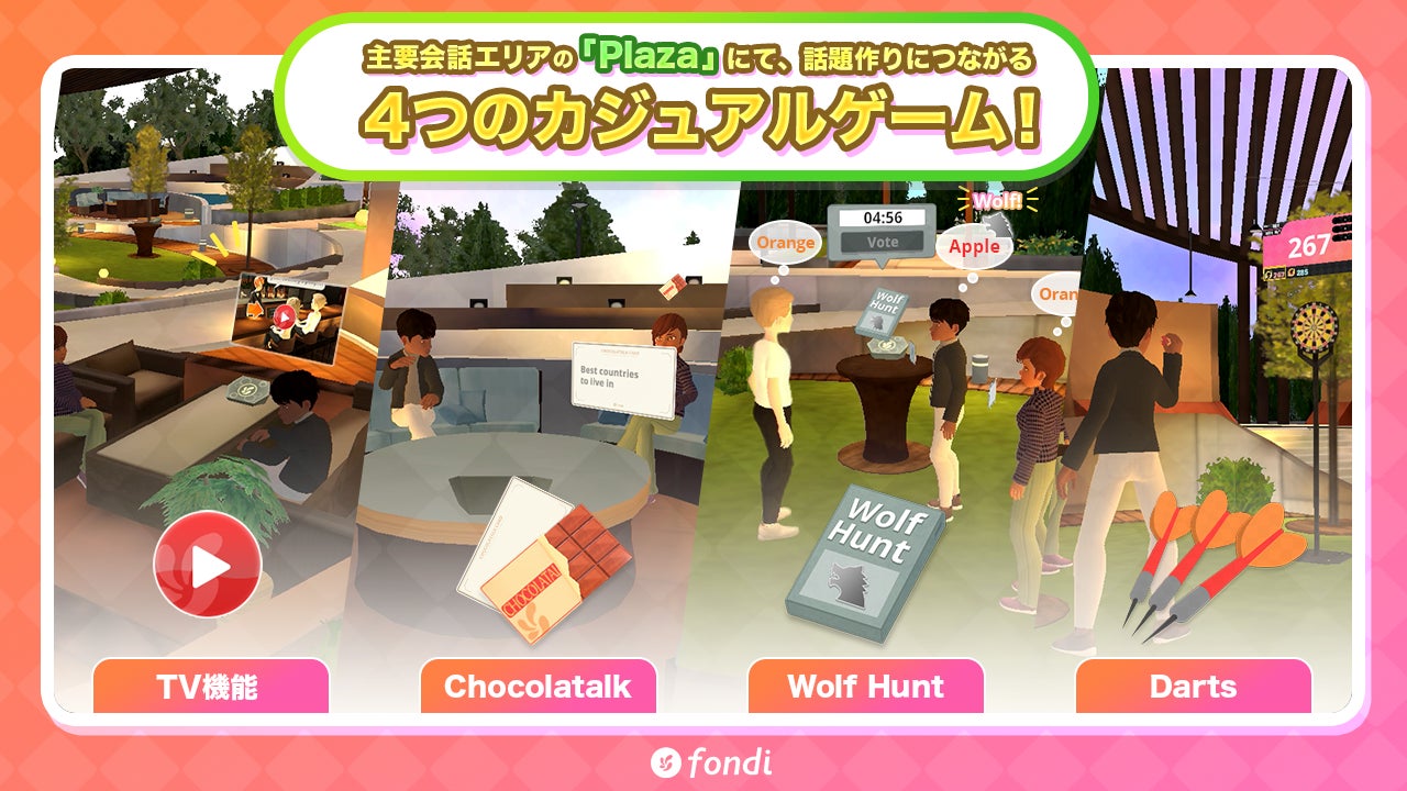株式会社fondi(本社:東京都渋谷区、代表取締役社長:野原樹斗)は、運営する英会話メタバース “fondi”のバーチャル空間において、英会話を盛り上げるためのカジュアルゲームを正式公開しました。これにより、主要会話エリアである「Plaza」にて、英語学習者・英会話初心者同士で話す中でも、話題を作る障壁を下げることができます。