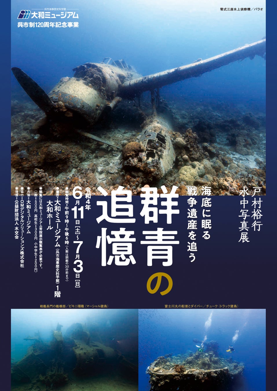 OCEAN PLANET(代表:水中写真家・戸村裕行)は、太平洋戦争に関連する世界各地の海底に眠る艦船・航空機・潜水艦などを自ら潜水し撮影した水中写真展「群青の追憶」〜海底に眠る戦争遺産を追う〜を、令和4年6月11日(土)〜7月3日(日)の会期で大和ミュージアム(呉市海事歴史科学館)1階・大和ホールにて開催致します。