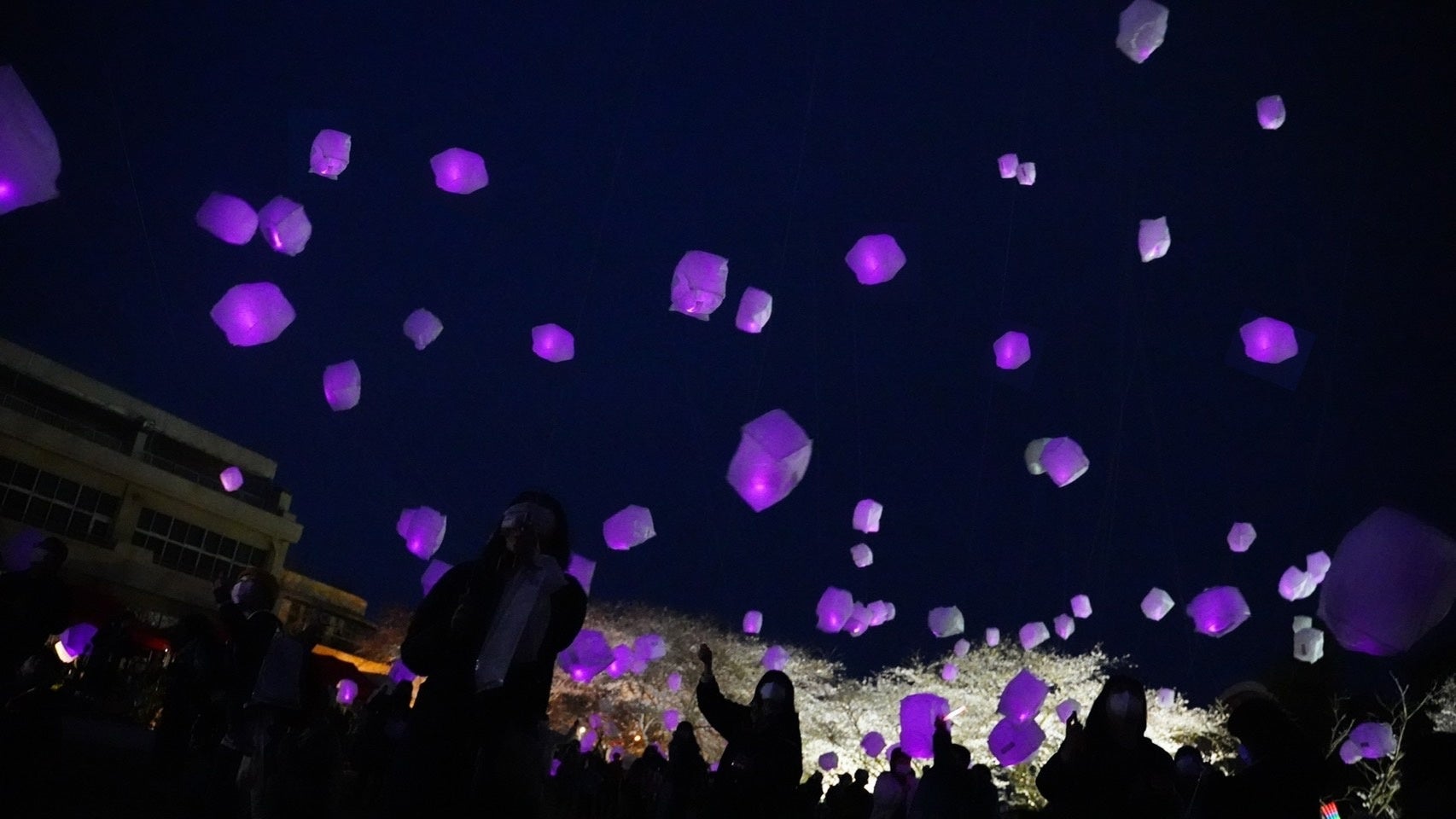 夜桜をバックに桜色のLEDランタンが灯る「おいも夜桜スカイランタンフェスティバル」開催