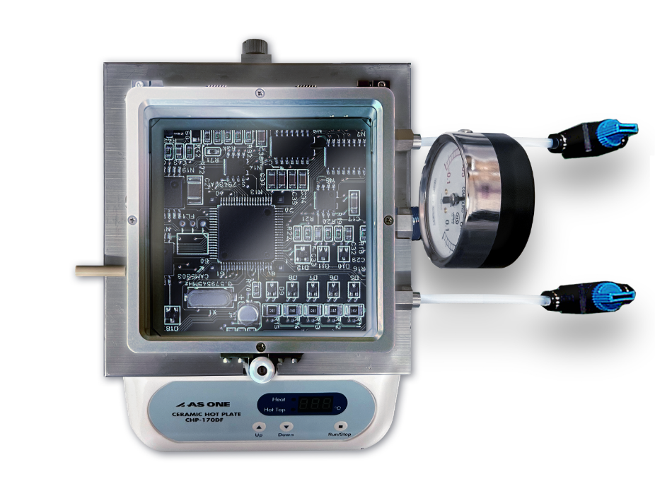 弊社のリフロー炉はリーズナブルな価格にもかかわらず、この一台で真空環境や窒素をはじめとした雰囲気を設定でき、ホットプレート(アズワン製)と組み合わせる事によってPID制御による高い温度コントロール性を実現しています。さらに、Labにも設置しやすい世界最小クラス(リフロー炉 外形:W145㎜×D153㎜×H31㎜)のコンパクトさを実現しております。