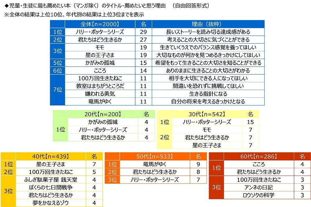 年代別にみると、20代では「かがみの孤城」「ハリー・ポッターシリーズ」「君たちはどう生きるか」(いずれも4名)、30代では「ハリー・ポッターシリーズ」(15名)、40代では「星の王子さま」(7名)、50代では「竜馬がゆく」(9名)、60代では「こころ」「君たちはどう生きるか」(いずれも4名)が1位でした。