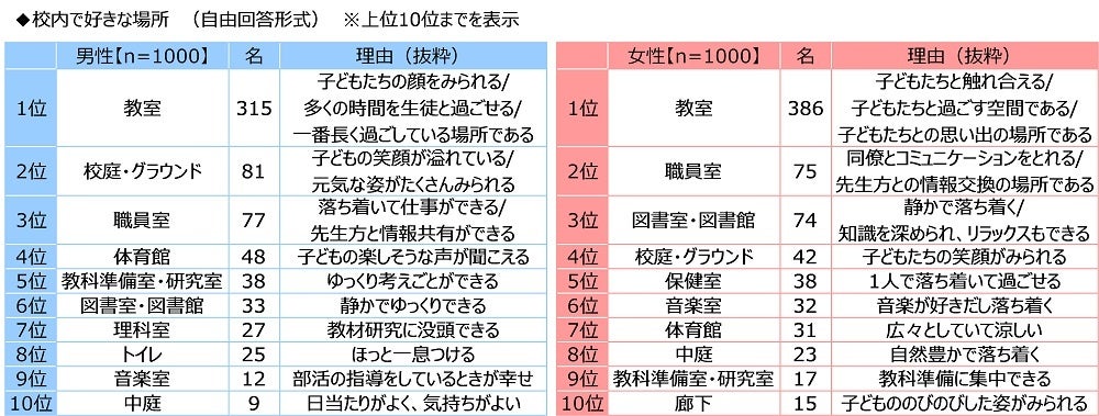 男女別のTOP3の理由をみると、男性の場合、「教室」では「子どもたちの顔をみられる」や「多くの時間を生徒と過ごせる」、「一番長く過ごしている場所である」、「校庭・グラウンド」では「子どもの笑顔が溢れている」や「元気な姿がたくさんみられる」、「職員室」では「落ち着いて仕事ができる」や「先生方と情報共有ができる」といった回答が挙がりました。また、女性の場合、「教室」では「子どもたちと触れ合える」や「子どもたちと過ごす空間である」、「子どもたちとの思い出の場所である」、「職員室」では「同僚とコミュニケーションをとれる」や「先生方との情報交換の場所である」、「図書室・図書館」では「静かで落ち着く」や「知識を深められ、リラックスもできる」といった回答が挙がりました。