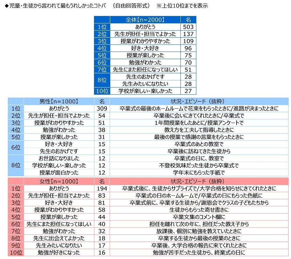 最もうれしかったコトバをもらったときの状況・エピソードをみると、男女ともに1位の「ありがとう」では「卒業式の最後のホームルームで花束をもらったときに」や「進路が決まったときに」、「卒業式後に、生徒からサプライズで」、「大学合格を知らせにきてくれたときに」、2位の「先生が担任・担当でよかった」では「卒業後に会いにきてくれたときに」や「卒業式で」、「卒業式の日のホームルームで」、「卒業式の日にもらった色紙に」といった回答がありました。