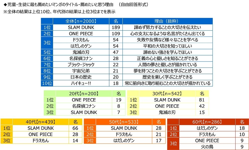 TOP3となった回答について、薦めたいと思う理由をみると、1位の「SLAM DUNK」では「諦めず努力することの大切さを伝えたい」、2位の「ONE PIECE」では「心の支えになるような名言がたくさん出てくる」、3位の「ドラえもん」では「失敗や友情など様々なことを学べる」、「はだしのゲン」では「平和の大切さを知ってほしい」といった回答がありました。