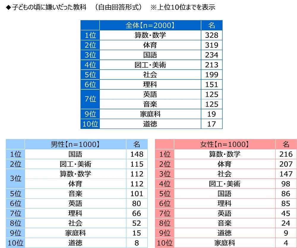 他方、子どもの頃に嫌いだった教科を聞いたところ、“子どもの頃に好きだった教科”と同様に「算数・数学」(328名)が1位でした。図形などパズル的な要素の強い分野の勉強は楽しんでいた一方で、関数など抽象的な概念について学ぶところでは苦戦したり躓いていたりした人が多いのではないでしょうか。次いで、2位「体育」(319名)、3位「国語」(234名)、4位「図工・美術」(213名)、5位「社会」(199名)となりました。