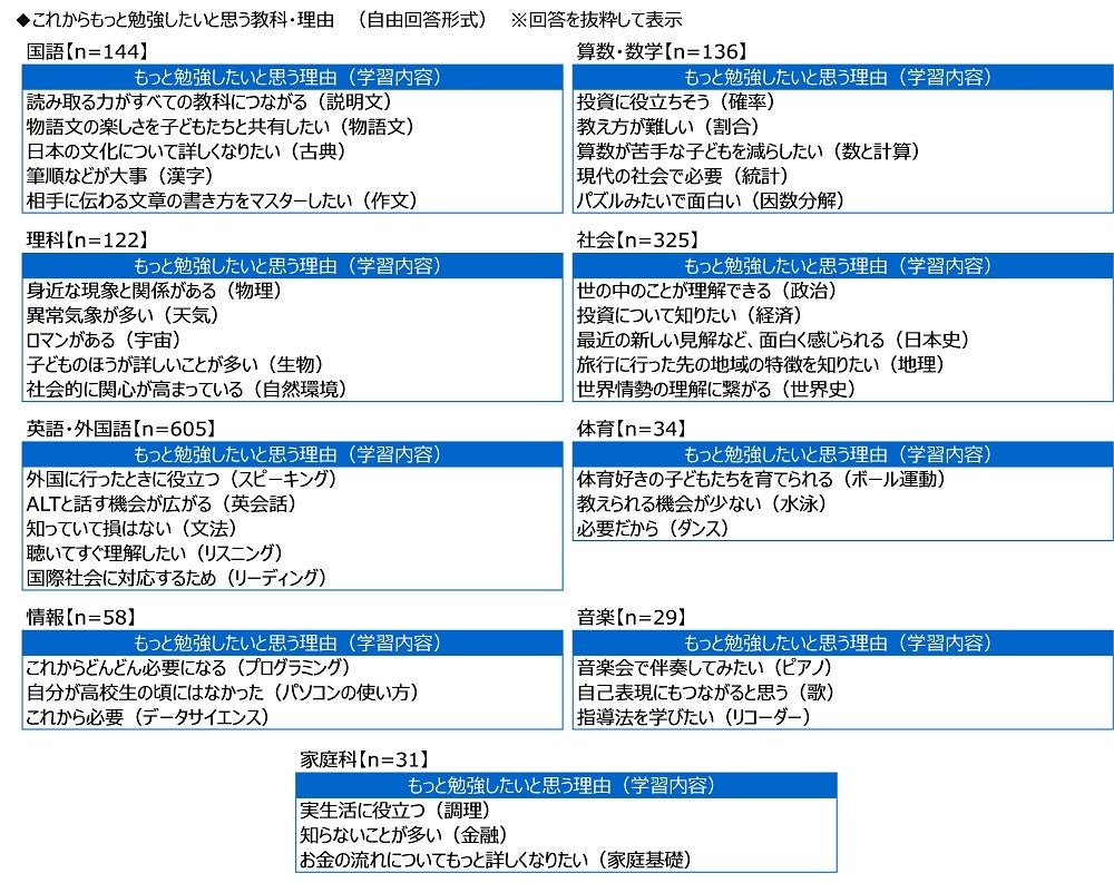 もっと勉強したいと思う理由と学習内容をみると、国語では「読み取る力がすべての教科につながる(説明文)」や「物語文の楽しさを子どもたちと共有したい(物語文)」、「相手に伝わる文章の書き方をマスターしたい(作文)」、算数・数学では「投資に役立ちそう(確率)」や「算数が苦手な子どもを減らしたい(数と計算)」、「現代の社会で必要(統計)」、理科では「身近な現象と関係がある(物理)」や「ロマンがある(宇宙)」、「社会的に関心が高まっている(自然環境)」、社会では「世の中のことが理解できる(政治)」や「最近の新しい見解など、面白く感じられる(日本史)」、「世界情勢の理解に繋がる(世界史)」、英語・外国語では「外国に行ったときに役立つ(スピーキング)」や「聴いてすぐ理解したい(リスニング)」、「国際社会に対応するため(リーディング)」といった回答がありました。