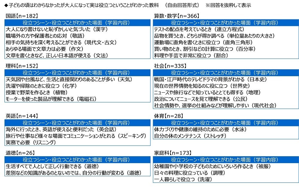 また、体育では「体力づくりや健康の維持のために必要(水泳)」、道徳では「生活すべてで人として正しく行動できる(道徳)」、家庭科では「一人暮らしで役立つ(洗濯)」といった回答がありました。