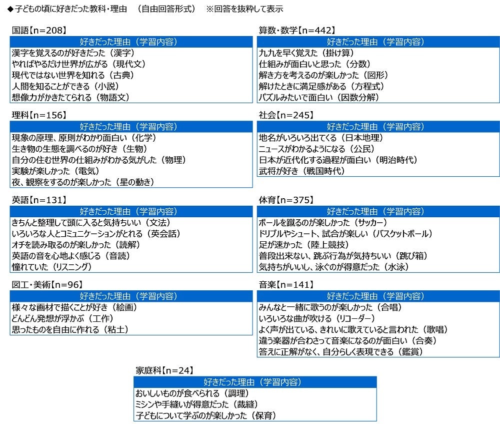 また、体育では「ボールを蹴るのが楽しかった(サッカー)」や「ドリブルやシュート、試合が楽しい(バスケットボール)」、図工・美術では「様々な画材で描くことが好き(絵画)」や「思ったものを自由に作れる(粘土)」、音楽では「みんなと一緒に歌うのが楽しかった(合唱)」や「答えに正解がなく、自分らしく表現できる(鑑賞)」、家庭科では「おいしいものが食べられる(調理)」や「ミシンや手縫いが得意だった(裁縫)」といった回答がありました。