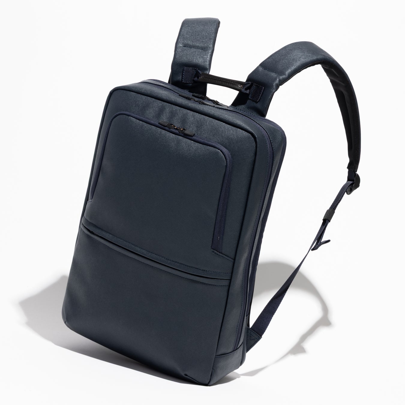 スマートな見た目にもかかわらず、しっかりした収納力を誇ります。バックパックとボディバッグはガバッと開くフルオープン仕様で、容量もたっぷり。バックパックは“ササマチ”という2つ折りのマチで、中身が横からこぼれ落ちるのを防ぎます。また、ダークネイビーの生地にさりげないアクセントとしてダークブラウンのパーツを合わせ、単調にならないよう工夫をしています。