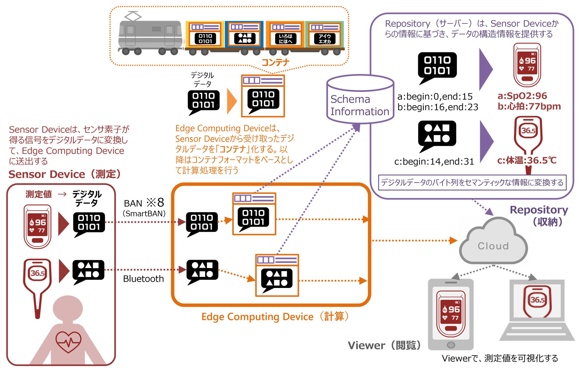 Edge Computing Deviceは、Sensor Deviceから受け取ったデジタルデータを「コンテナ」化する。以降はコンテナフォーマットをベースとして計算処理を行う。 |