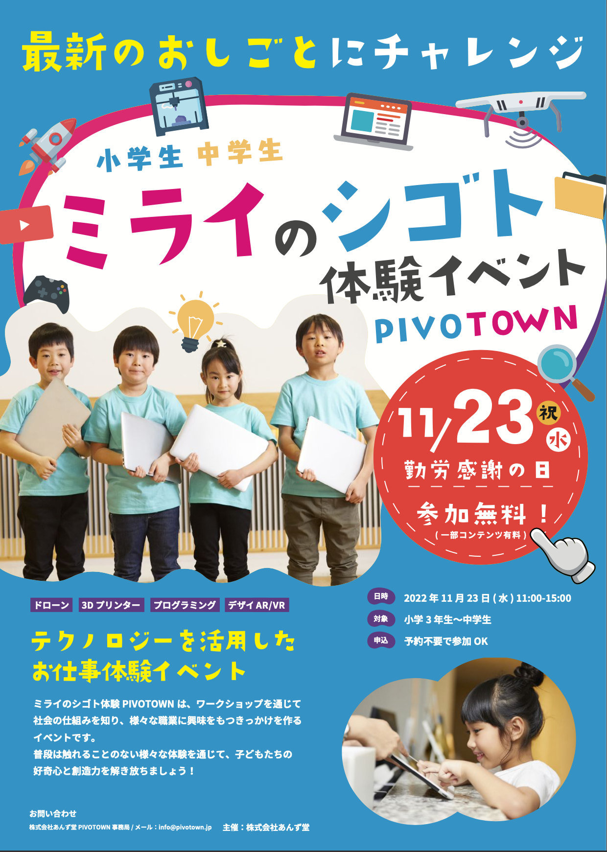 株式会社あんず堂(所在地:大阪市北区角田町1番12号阪急ファイブアネックスビル GVH#5 代表:播磨貴文)は、2022年11月23日にOSAKA FOOD LABイベントスペースにて、最新テクノロジー5団体協力のもと、小中学生に向けた未来の職業体験イベント「ミライのシゴト体験 PIVO TOWN」を開催いたします。