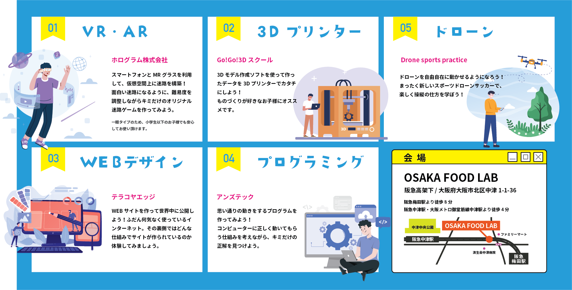 当イベントでは、いま注目されるテクノロジーを専門とする企業/団体全5団体が子どもたちに向けて、それぞれVR/AR、3Dプリンター、webデザイン、プログラミングなど特別プログラムを提供します。