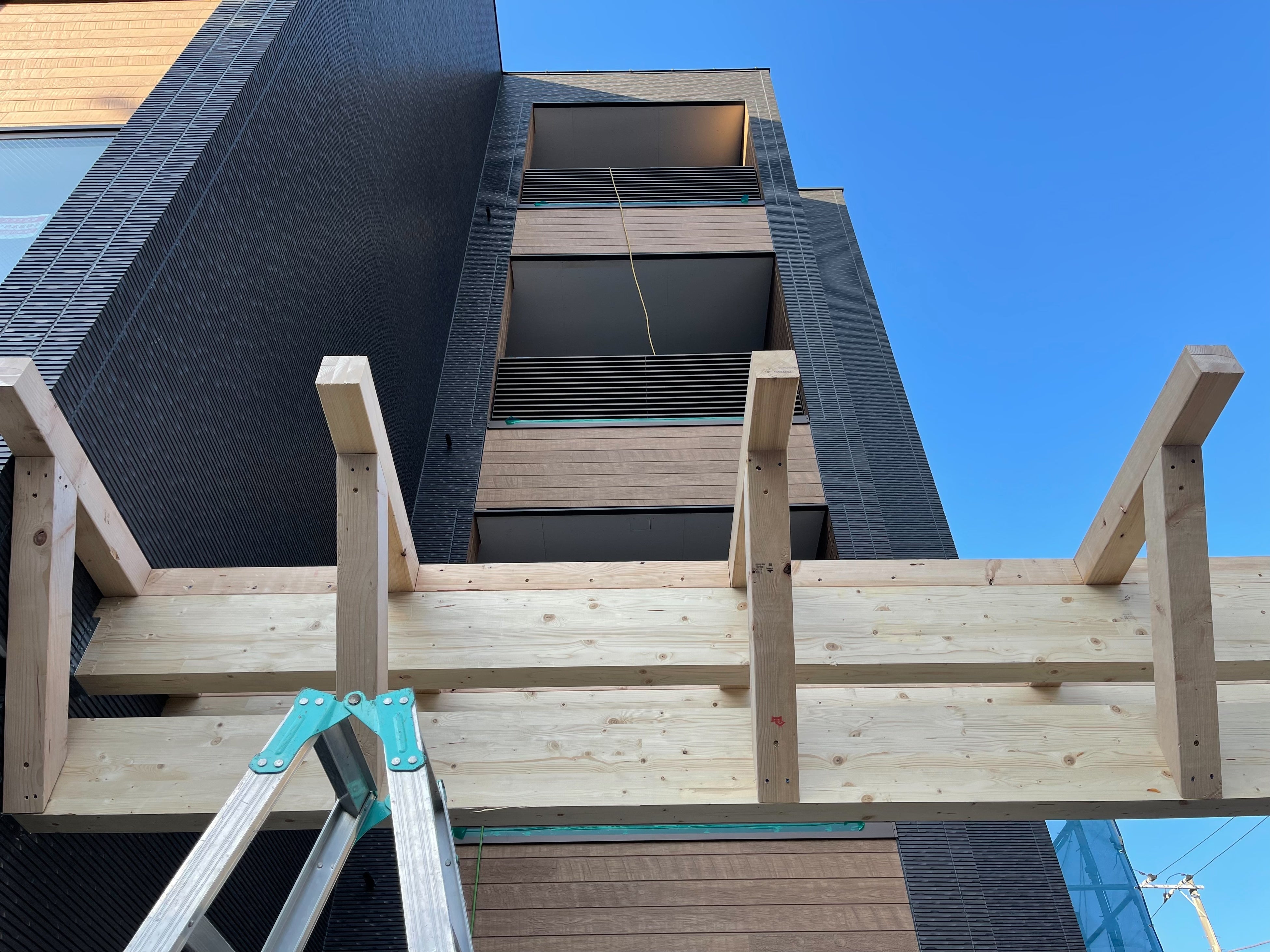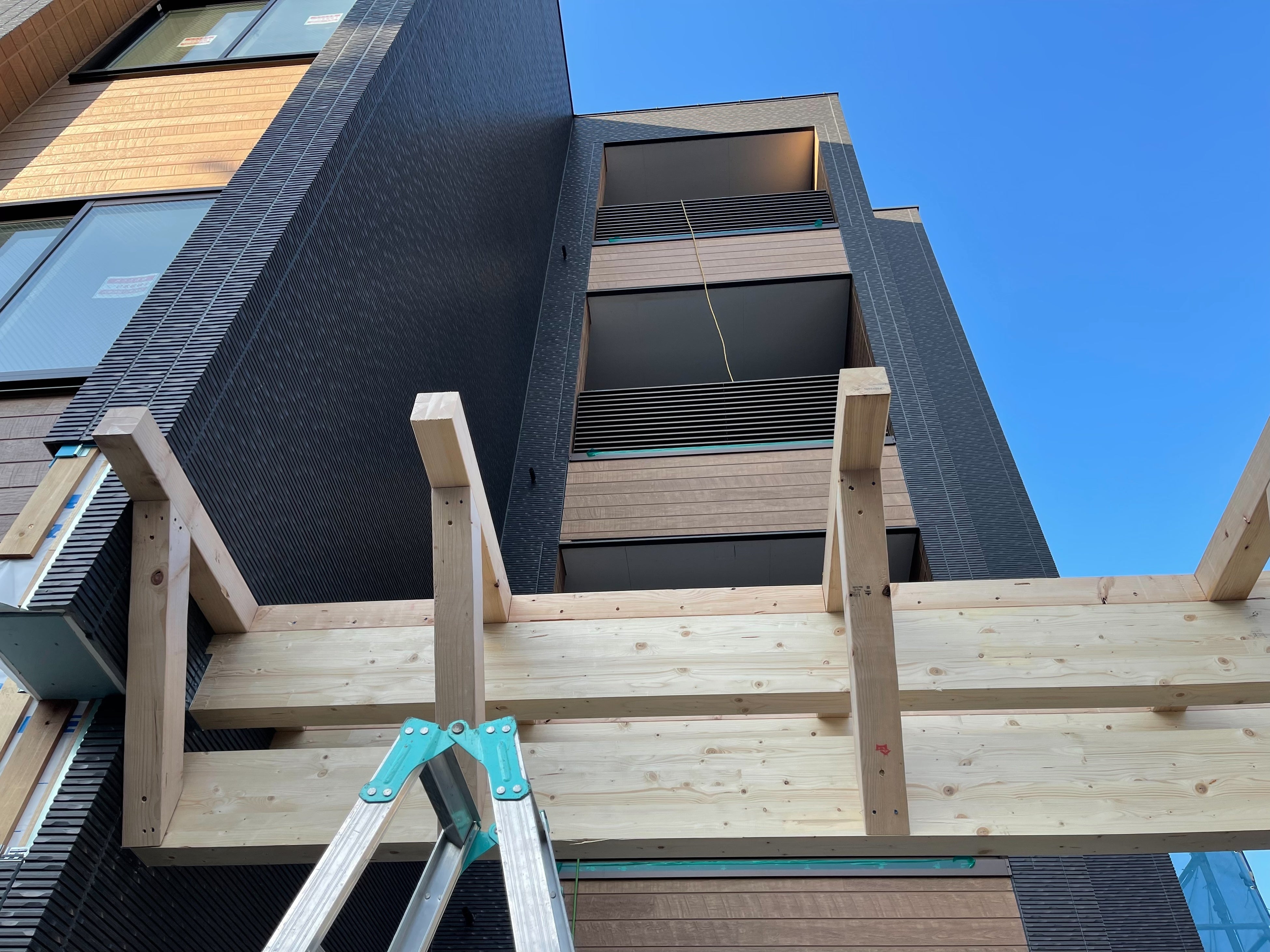 1. 湘南地域初、1階から4階は木造建築による300平米超の民間の中高層複合ビル。規模・用途・高さ(階数)共に、国産・地域産木材(神奈川県丹沢産材一部使用)を活用したものとしては、湘南地域では初めての試み。