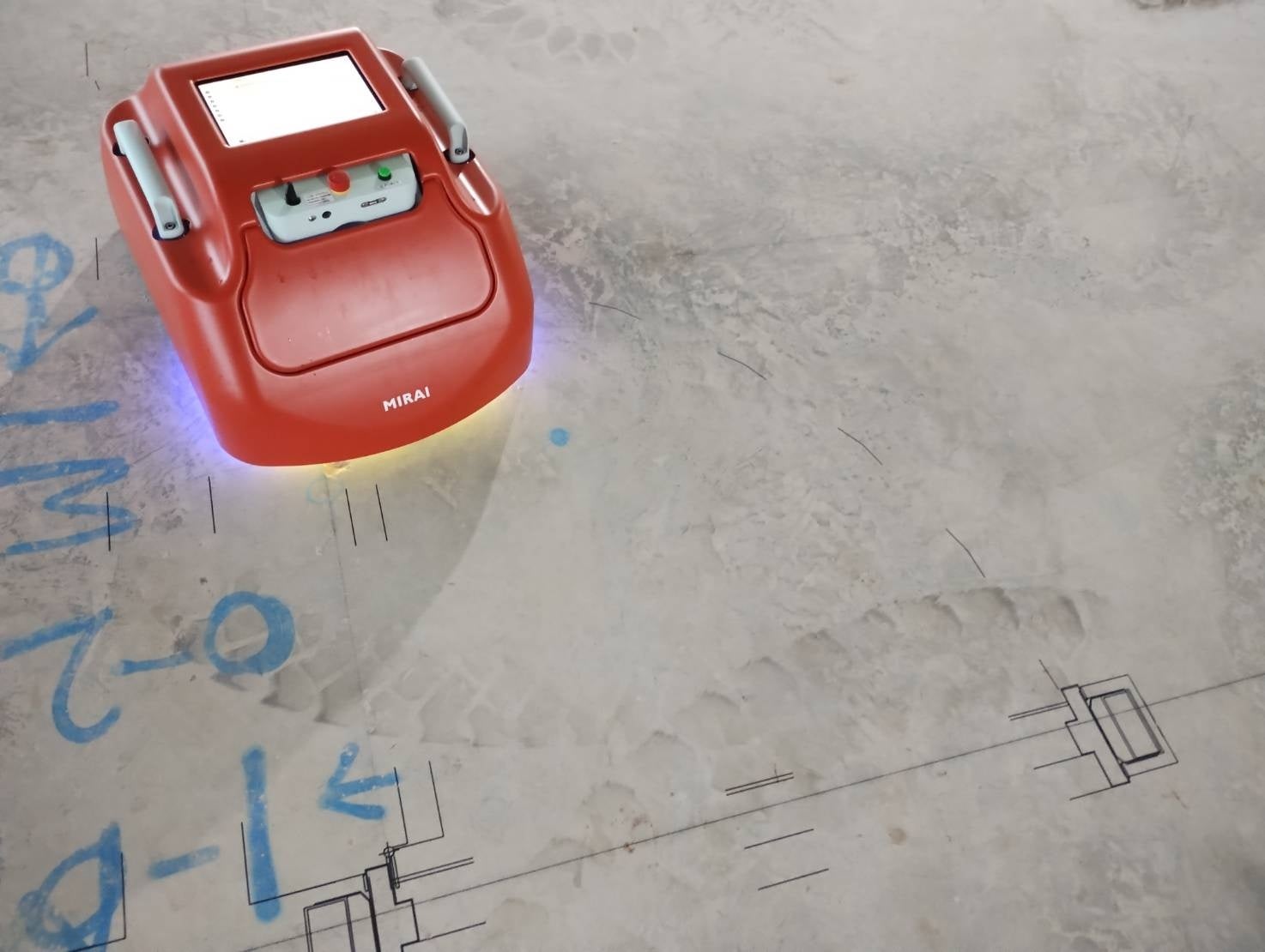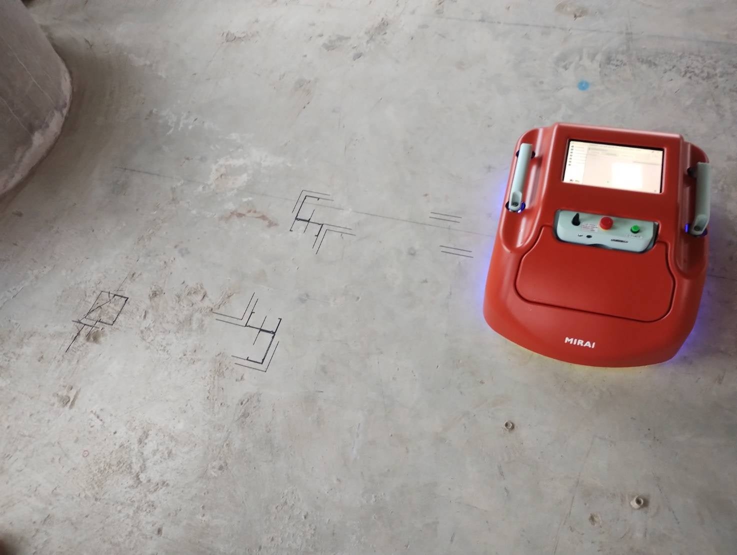 建設現場における「墨出し」は設計図面に基づいて建物の基準となる線や点を現場に直接マーキングする作業です。これにより建物の位置、寸法、水平・垂直の基準が明確になり、工事が正確に行われることが保証されます。当社墨出しロボットは設計データをもとに測距器(ライカジオシステムズ社製)で正確な現場位置を確かめながら1mm~3mm(ロボットと測距器の距離による)という精度の高い墨出しを自動で行うことができます。