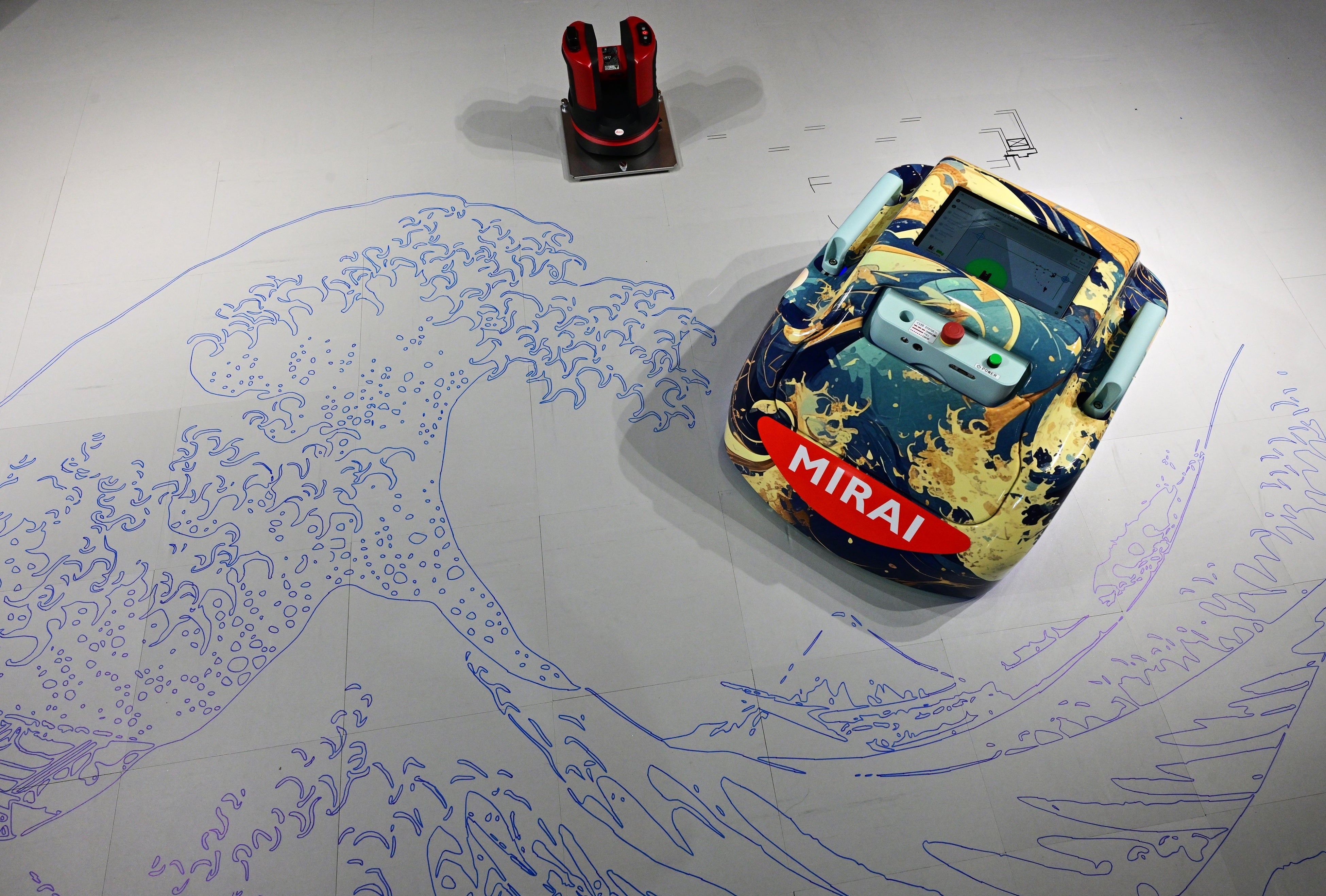 今回ドイツでの展示会出展に合わせて、商品名を『HOKUSAI』とし、HOKUSAIをイメージさせる特別ラッピングボディを用意し、欧州で人気の高い葛飾北斎「神奈川沖浪裏図」を展示会ブース床面に緻密に再現することで注目を集め、ある来場者からは「まるでロボットに北斎が宿り絵筆を走らせているようにさえ見える」と賞賛の声も頂戴しました。