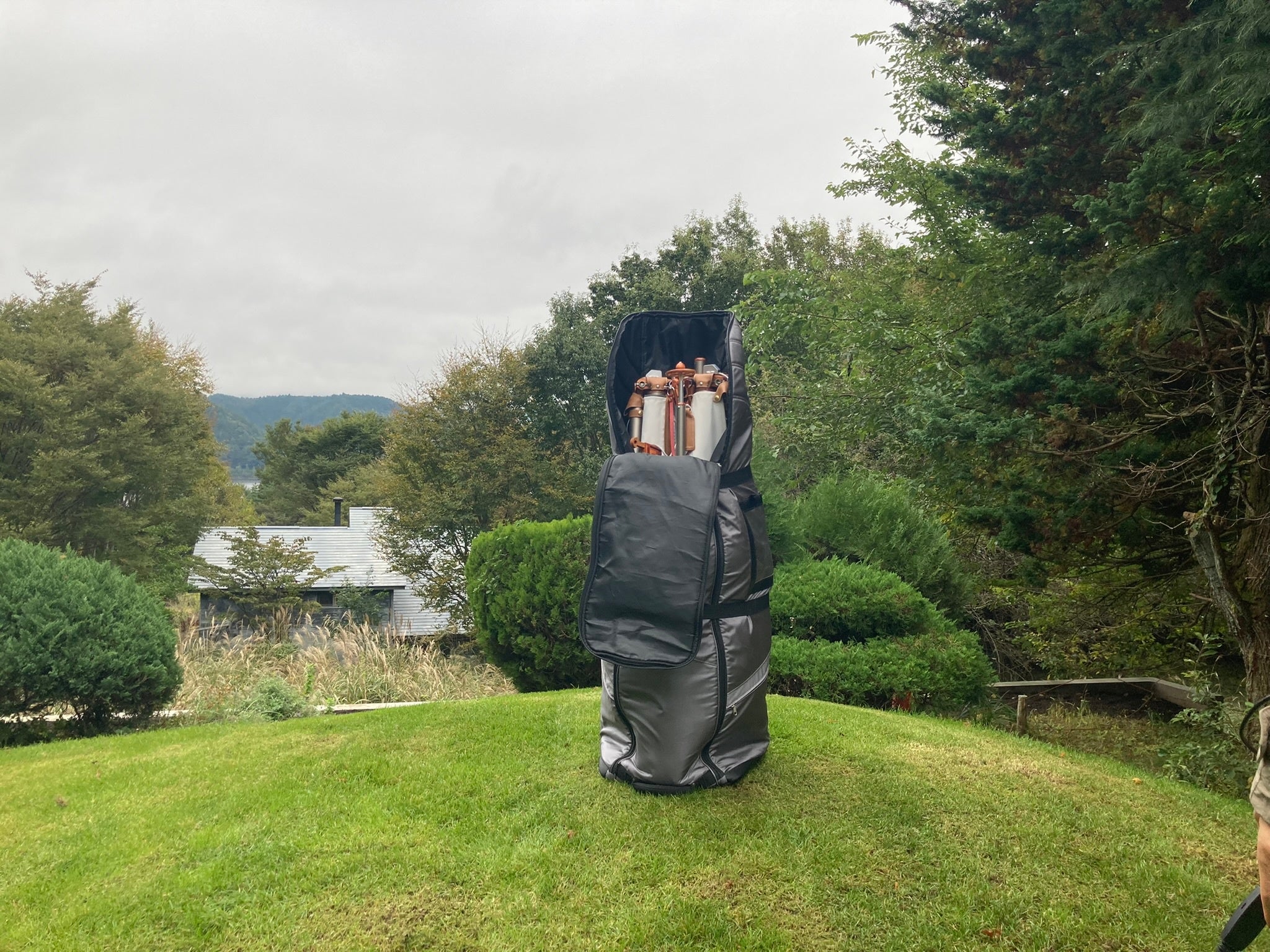 女性一人でも5分もあれば設営・撤収が可能。折りたたむとゴルフバックに収納でき