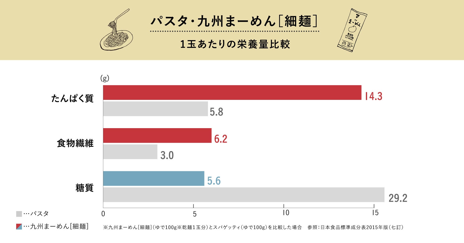 大豆麺としての栄養価・機能性はこれまでの「九州まーめん」と同様。一般的な小麦麺と比べると約80%糖質をカットできます。さらにたんぱく質・食物繊維たっぷりで、栄養面でも低糖質ダイエットをサポートします。