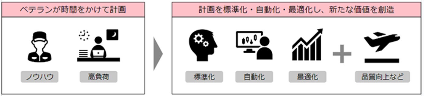 エー・スター・クォンタムとJALはこの問題を解決するため、2021年1月より、弊社が持つ量子コンピューティング技術や数理最適化を応用した実証実験を、制約条件を増やしながら段階的に進めてまいりましたが、実用化のめどが付いたことから、今回の開発決定に至りました。このアプリケーションにより、ベテラン社員のノウハウを継承しながら、最適な計画を自動的かつ短時間に策定することが可能となります。また、計画を最適化することにより、品質向上などの新たな価値創造に繋げます。