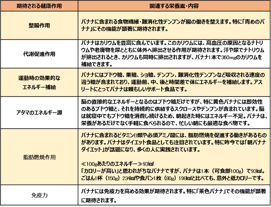 バナナには、多彩に含まれる栄養成分の働きやその構成によって、「ダイエット効果」など、現代人に求められる様々な健康機能が期待できます。