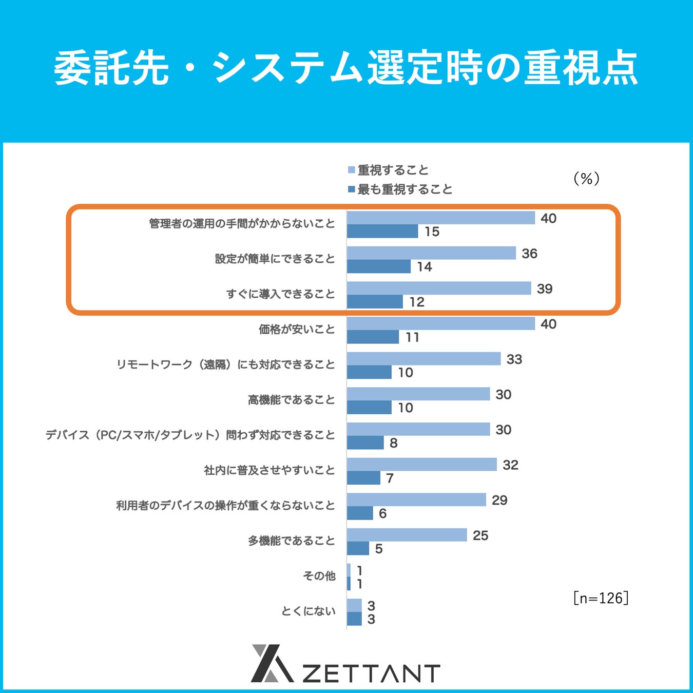 システム会社/システム選定において最も重視すること上位は「管理者の運用の手間がかからないこと」「設定が簡単であること」「すぐに導入できること」