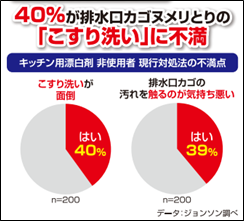 「キッチンの排水口カゴの掃除」についてジョンソンが調査を行ったところ、キッチン用漂白剤を使用していない人のうち、約60%が食器用洗剤を使用してこすり洗いをしていることがわかりました。さらに、現行の対処方法について、「こすり洗いが面倒」「排水口カゴの汚れに触るのが気持ち悪い」と感じており、不満を持っている方がいることがわかりました。