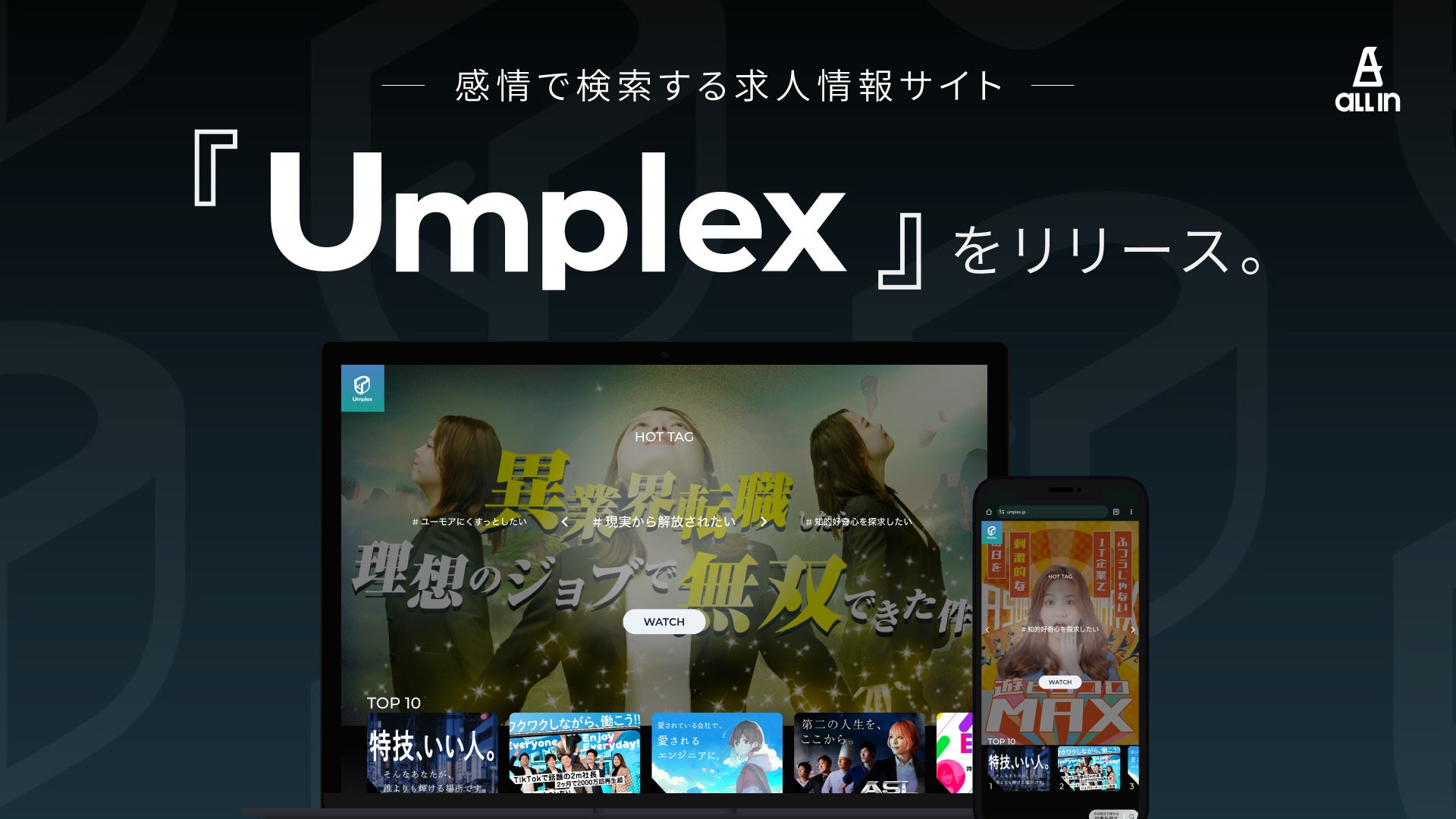 この現状に課題を感じ続けていたオールインは、「感情」を検索軸に据えた中途向けの求人情報サイト『Umplex』をリリース。先入観にとらわれない出会いの場を提供する、新しい形のメディアです。
