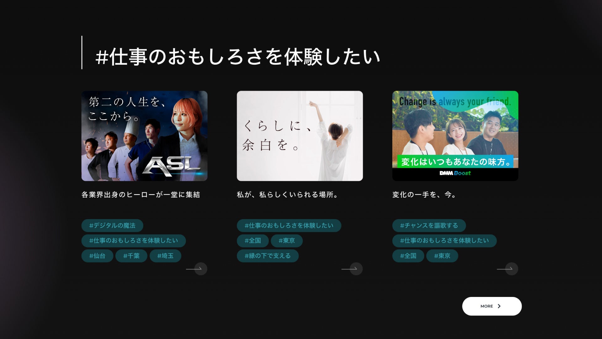 「#ロマンチックに浸りたい」「#ユーモアにくすっとしたい」「#現実から解放されたい」など、映画やWeb漫画を選ぶような気分で新しい仕事・新しい自分と出会えます。