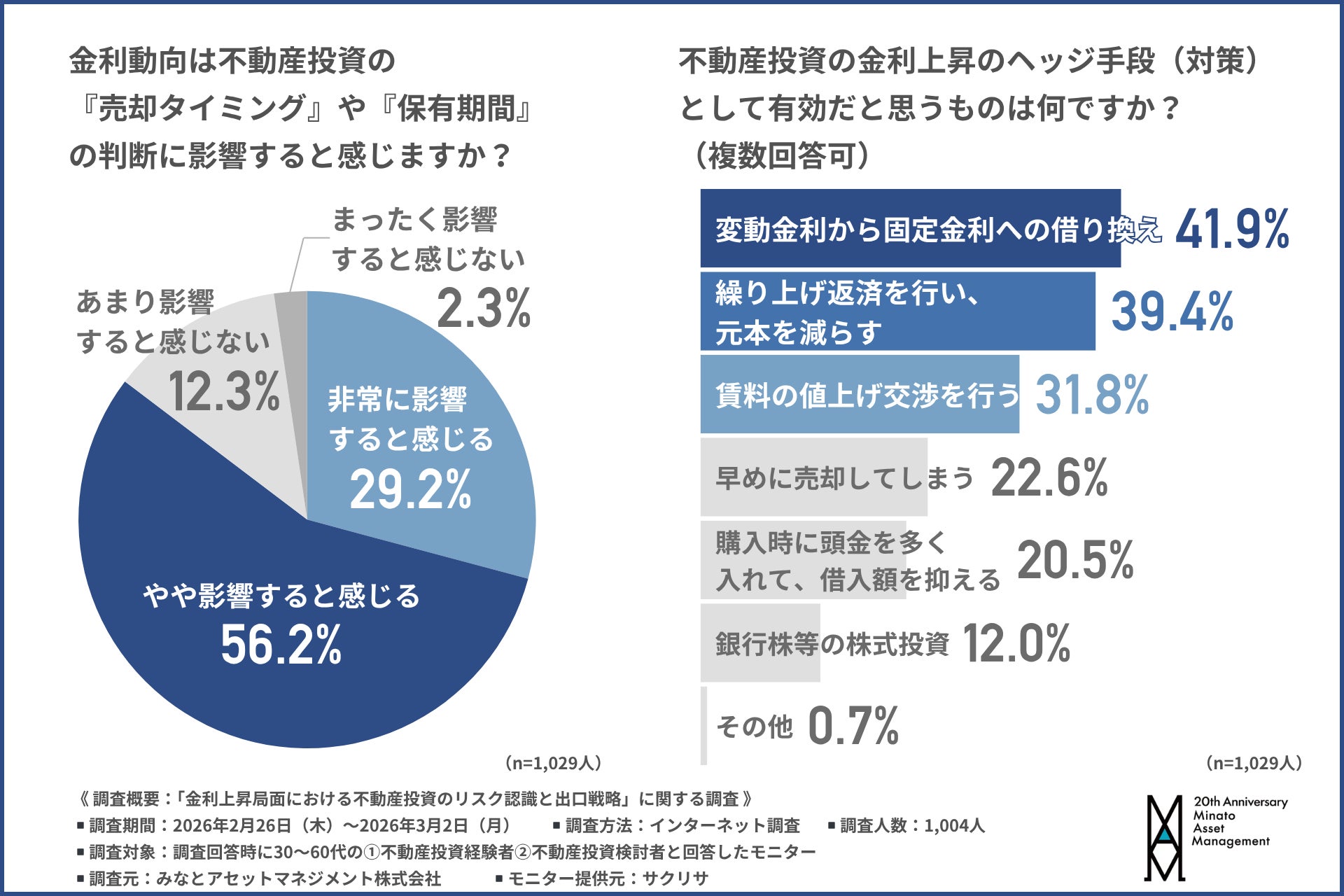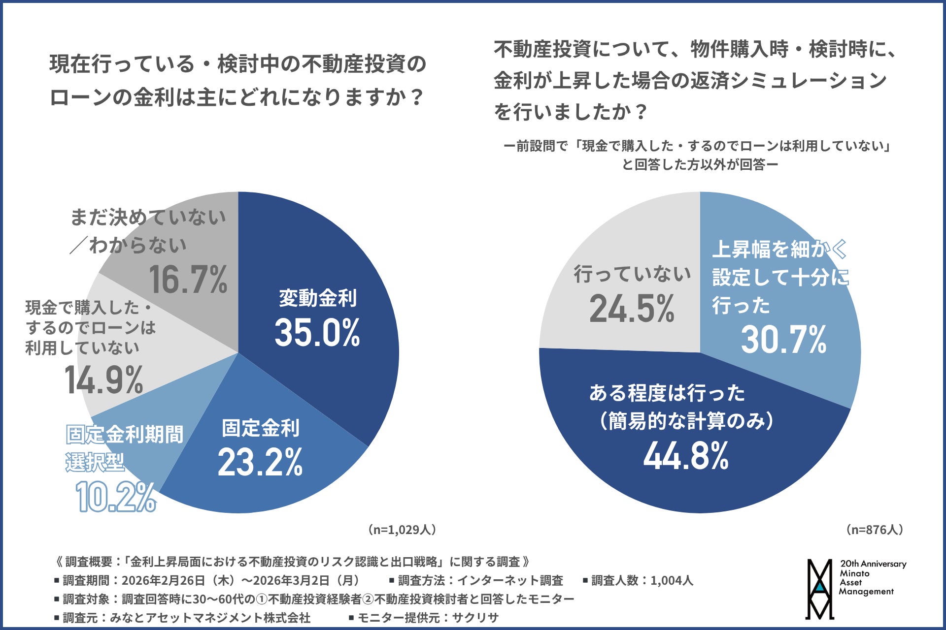 みなとアセットマネジメント株式会社(所在地:東京都港区、代表取締役:向井 啓和)は、30〜60代の①不動産投資経験者②不動産投資検討者を対象に「金利上昇局面における不動産投資のリスク認識と出口戦略」に関する調査を行いました。