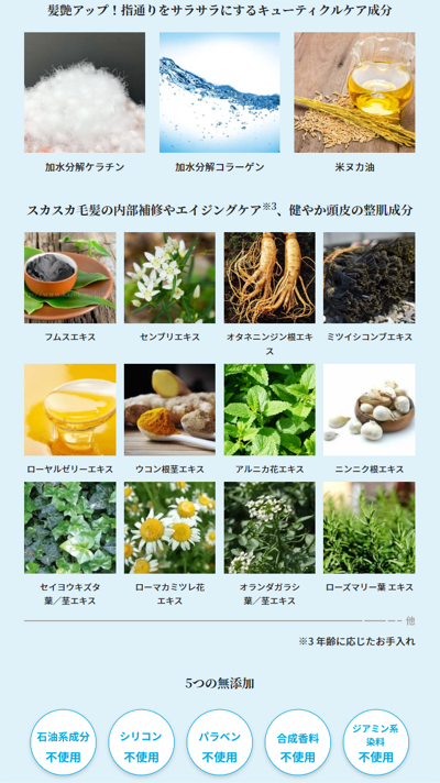 継続してお使いいただくため、ダメージを受けた頭皮と毛髪をケアするこだわりの天然由来の美髪成分を厳選してバランス配合。またこだわりの5つの無添加処方となっています。今の白髪や毛痩せの悩みだけでなく、将来生まれてくる髪が健康になるよう配慮した贅沢設計です。ツンとしたニオイは全くないふんわりオレンジピールの香り。