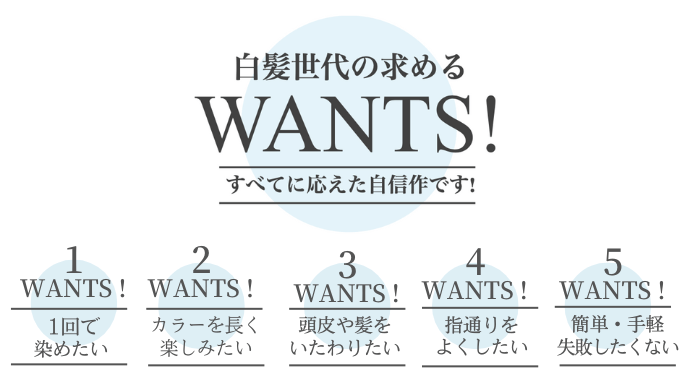 精神的に成熟し、人生を謳歌するミドル世代。見た目に疲れや年齢感を出てくる40代以降の白髪世代にアンケートし、生の声を聞いてみると、実は頭皮や髪に求めること(WANTS!)は大きく5つに分類されることがわかりました。