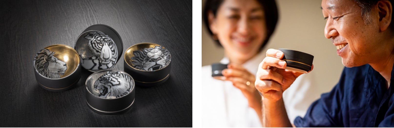 九谷焼では珍しい「黒」の絵付けによりカメラの世界観を再現。隠されたレンズのモチーフ、光を当てると透ける絵柄、大人の遊び心にあふれた盃(さかずき)です。繊細かつ迫力のある上絵付けは阿吽(あ・うん)をテーマに、側面を黒く彩色したレンズをモチーフとした形により、手に取る人が目でもお楽しみいただける商品です。