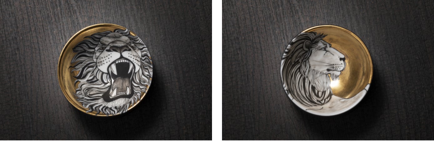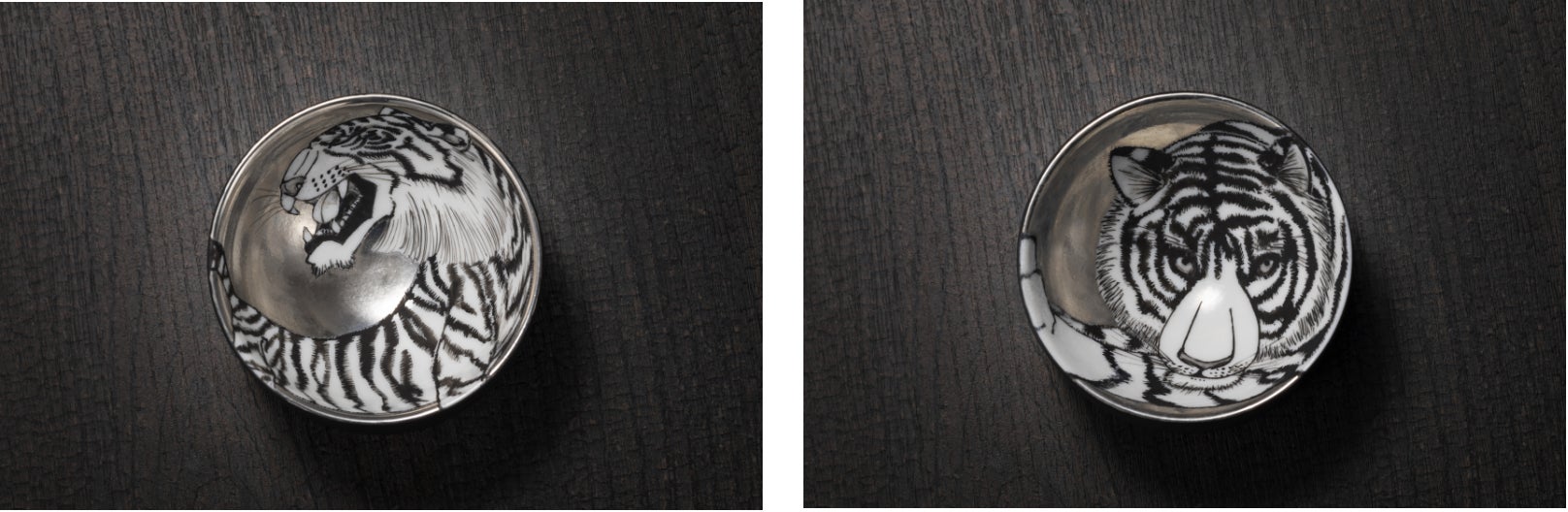 レンズの筐体をろくろの成形技術で表現。さらに盃を返すと、そこには隠されたレンズモチーフが。魚眼レンズを想わせる底面は透けるほどの薄さで造られ、光を通すと獅子と白虎を描いた黒い絵付けが浮かび上がります。