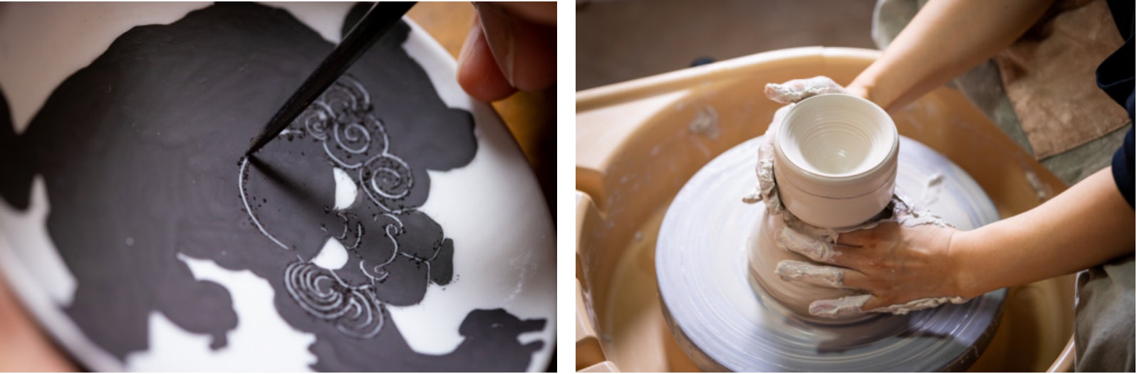 掻き落としという技法を得意とし、表情豊かに作画された動物は、九谷焼では珍しい黒い上絵付けを削り落として描かれています。そこから出現する線や素地の色は、豪快さと繊細さを合わせもつ独特な世界観がある。器の形に沿って自由に配置された迫力ある作品の数々は、多くのファンの心を掴んでいます。2017年、第56回 日本現代工芸美術展 現代工芸新人賞を受賞するなど、気鋭の九谷焼作家として注目を集めています。