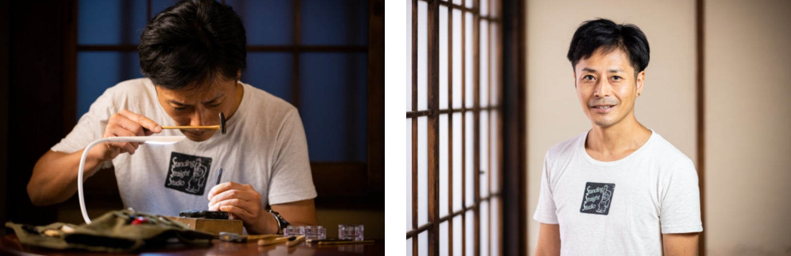 アメリカで彫金の学校を卒業後、現地で5年間彫金の技術を磨いた。熊本へ帰郷後、肥後象嵌の世界に魅せられアメリカで学んだ独自の彫金技術と伝統工芸の技術を融合。オリジナリティ溢れる世界観を追求している。