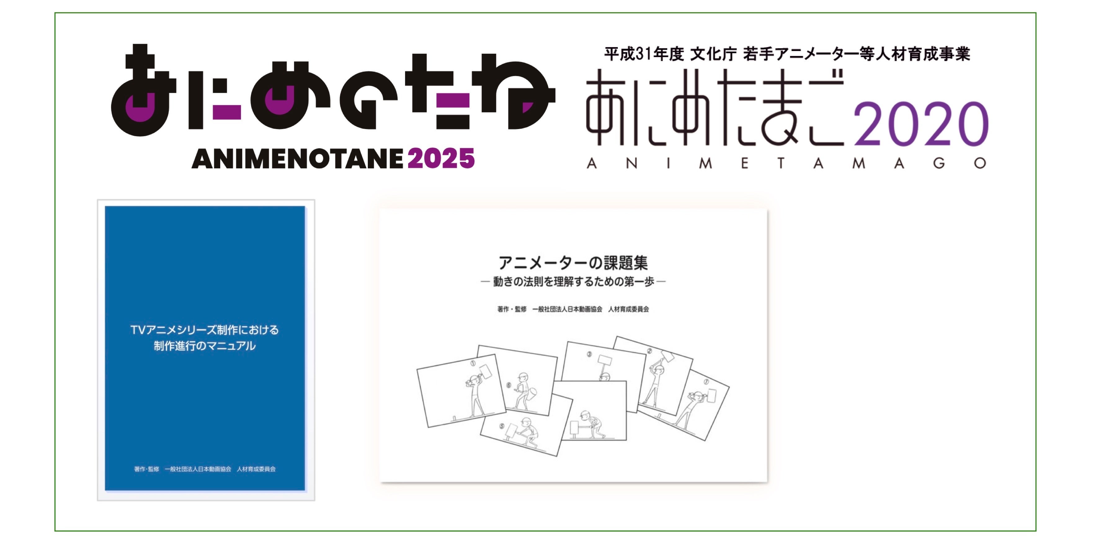 当協会では、アニメ業界における人材育成の一助となるべく2016年に人材育成委員会を設置し、これまで、文化庁若手アニメーター等人材育成事業(事業愛称「あにめたまご」)、文化庁アニメーション等人材育成調査研究事業(事業愛称「あにめのたね」)の運営や、『TVアニメシリーズ制作における 制作進行のマニュアル』、『アニメーターの課題集 -動きの法則を理解するための第一歩-』の学習教材の配布などの活動を通じて、人材育成に取り組んで参りました。